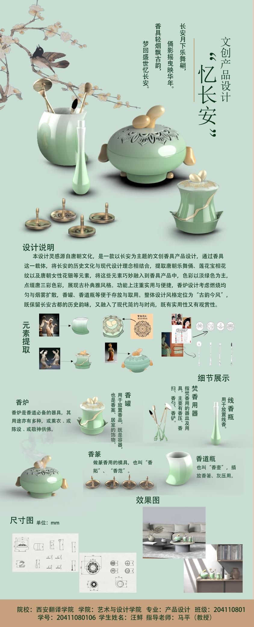 本设计是一款以长安为主题的文创香具产品设计,通过香具这一载体,将长安的历史文化与现代设计理念相结合,提取唐朝乐舞俑、莲花宝相花纹以及唐朝女性花钿等元素,将这些元素巧妙融入到香具产品中,色彩以淡绿色为主,点缀唐三彩色彩,展现古朴典雅风格。功能上注重实用与便捷,香炉设计考虑燃烧均匀与烟雾扩散,香罐、香道瓶等便于存放与取用。整体设计风格定位为“古韵今风”,既保留长安古都的历史韵味,又融入了现代简约与时尚,既有实用性又有观赏性。