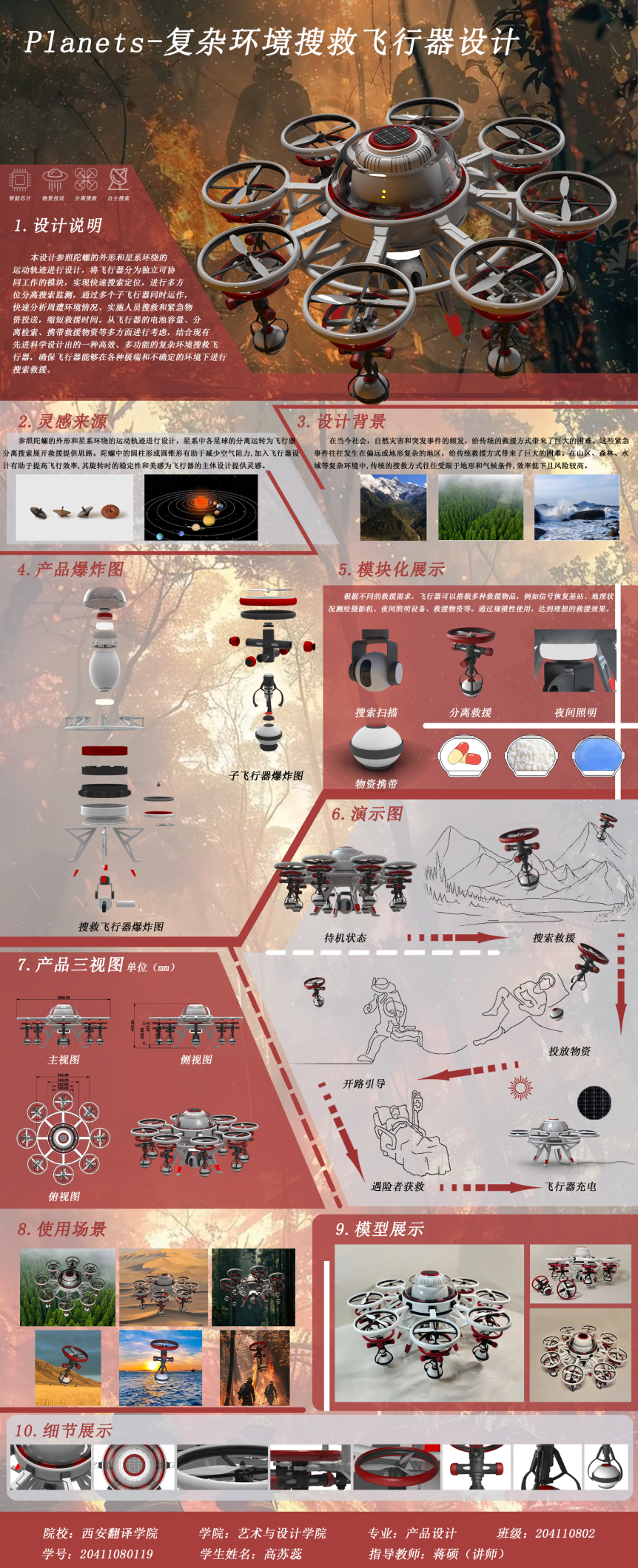 当遇到危险时,及时获取遇险人员的位置信息,是救援人员实施营救的前提。对复杂环境搜救飞行器进行设计和研究,不但可以提高搜索效率,还可以降低救援风险、扩展搜救范围。本次设计提出飞行器在复杂环境中搜索定位、携带物资救援的设计方案,将飞行器分为独立但可协同工作的模块,实现快速搜索定位,进行多方位分离搜索监测,通过多个子飞行器同时运作,快速分析周遭环境情况、实施人员搜救、紧急物资投送,从而缩短救援时间。从飞行器的电池容量、分离检索、携带救援物资等多方面进行考虑,结合现有的先进科学设计出一种高效、多功能的复杂环境搜救飞行器,确保复杂环境搜救飞行器能够在各种极端和不确定的环境下进行搜索救援。展示复杂环境搜救飞行器在提高救援效率、降低救援风险、携带紧急救援物资方面的显著优势,为未来救援提供新的解决方案。