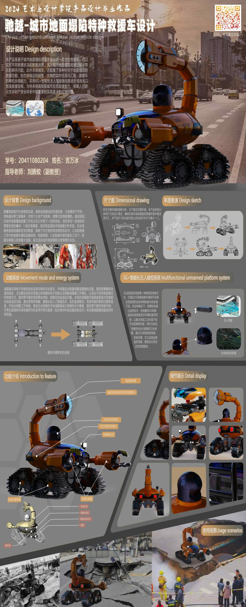 本产品是基于城市地面塌陷场景下设计的一款仿生救援车,可以应对不同救援状况和针对于地面塌陷的救援场景,满足城市地面塌陷救援过程中存在的棘手问题,化解在救援过程中的缺陷与不足。