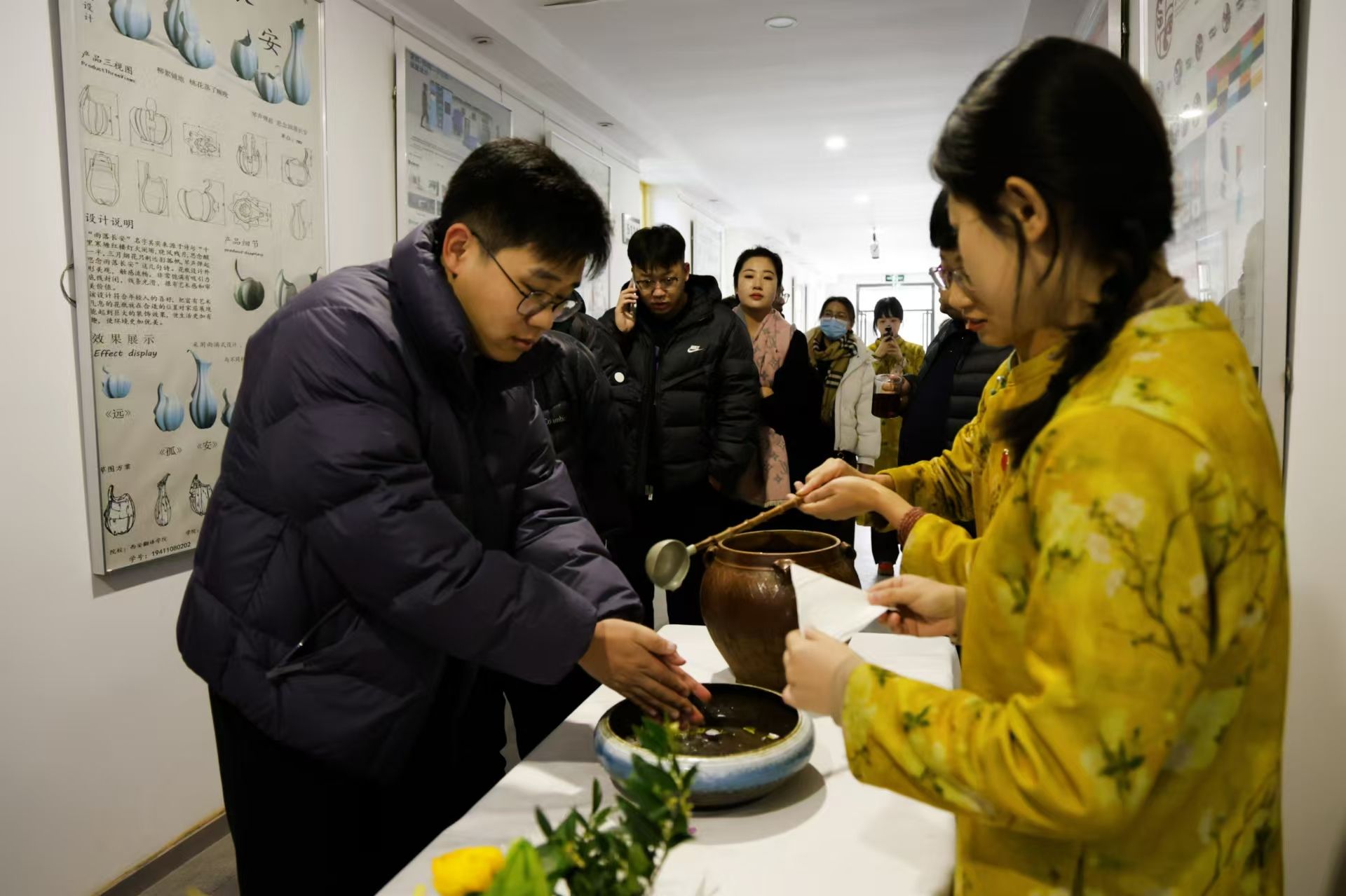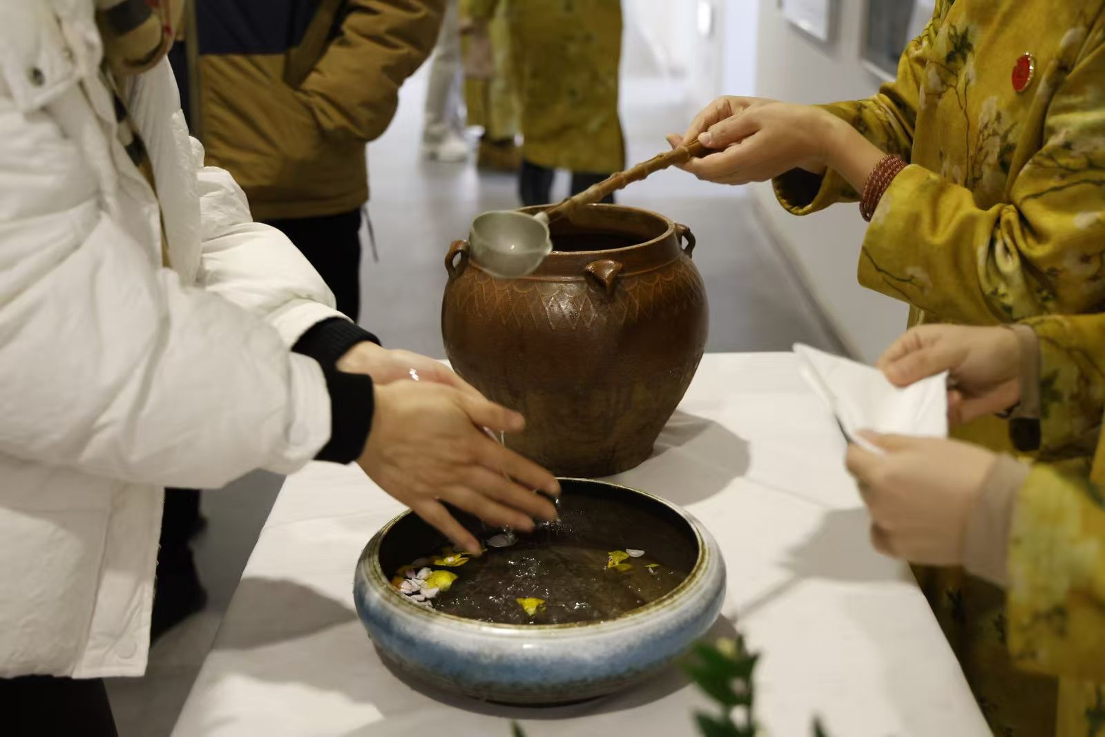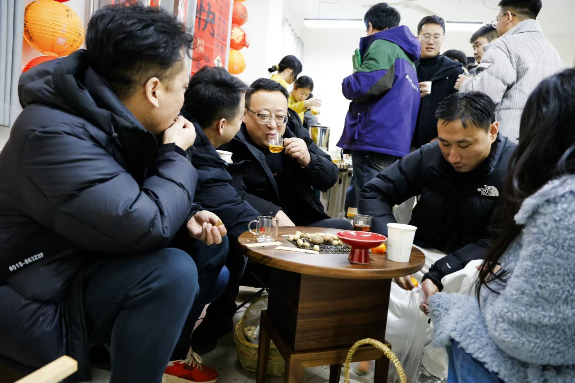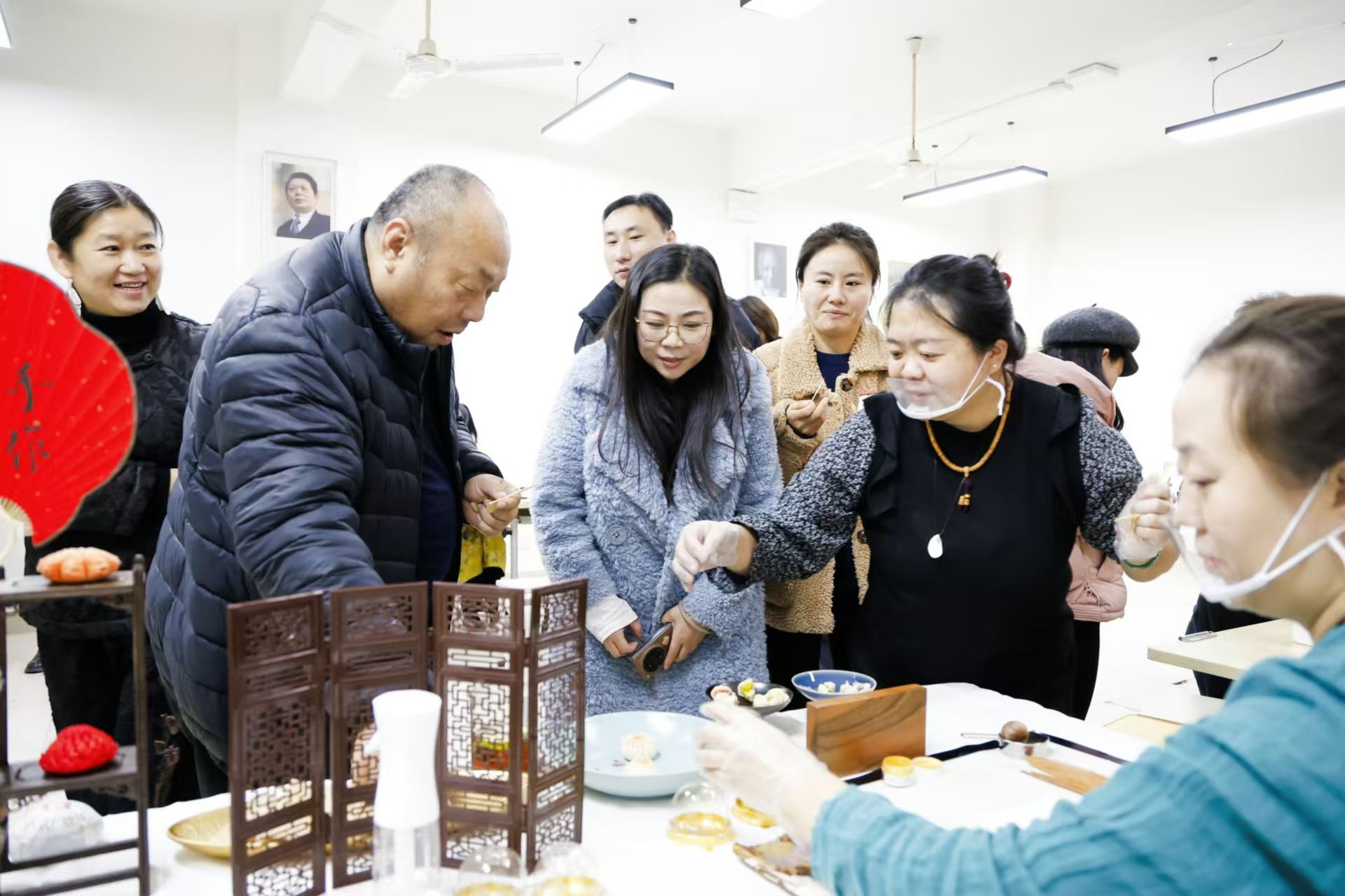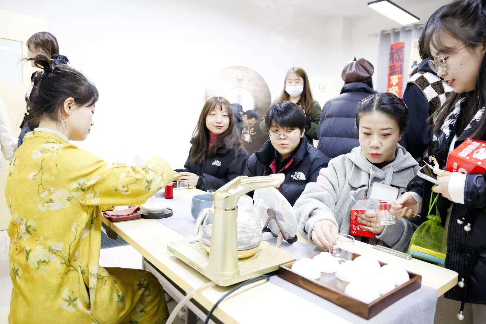 讲课完成后,老师们在茶艺师指引下,来到茶艺集市,品普洱老茶、喝新式普洱调饮茶、尝中式茶果子、敲空灵鼓、围炉煮茶,老师们亲身参与、亲自体验中国优秀的传统文化,大家一起围席而坐,在轻松愉快的氛围中,共赴这场冬日茶会,他们专注倾听,细心品味,茶香仿佛带着传统文化的精髓,缓缓沁入每一位老师的心田。不少老师表示:“中国茶文化博大精深,是珍贵的文化遗产。我们通过这次活动,学习到了‘茶和天下’的理念,体验了‘清静和雅’的精神。”