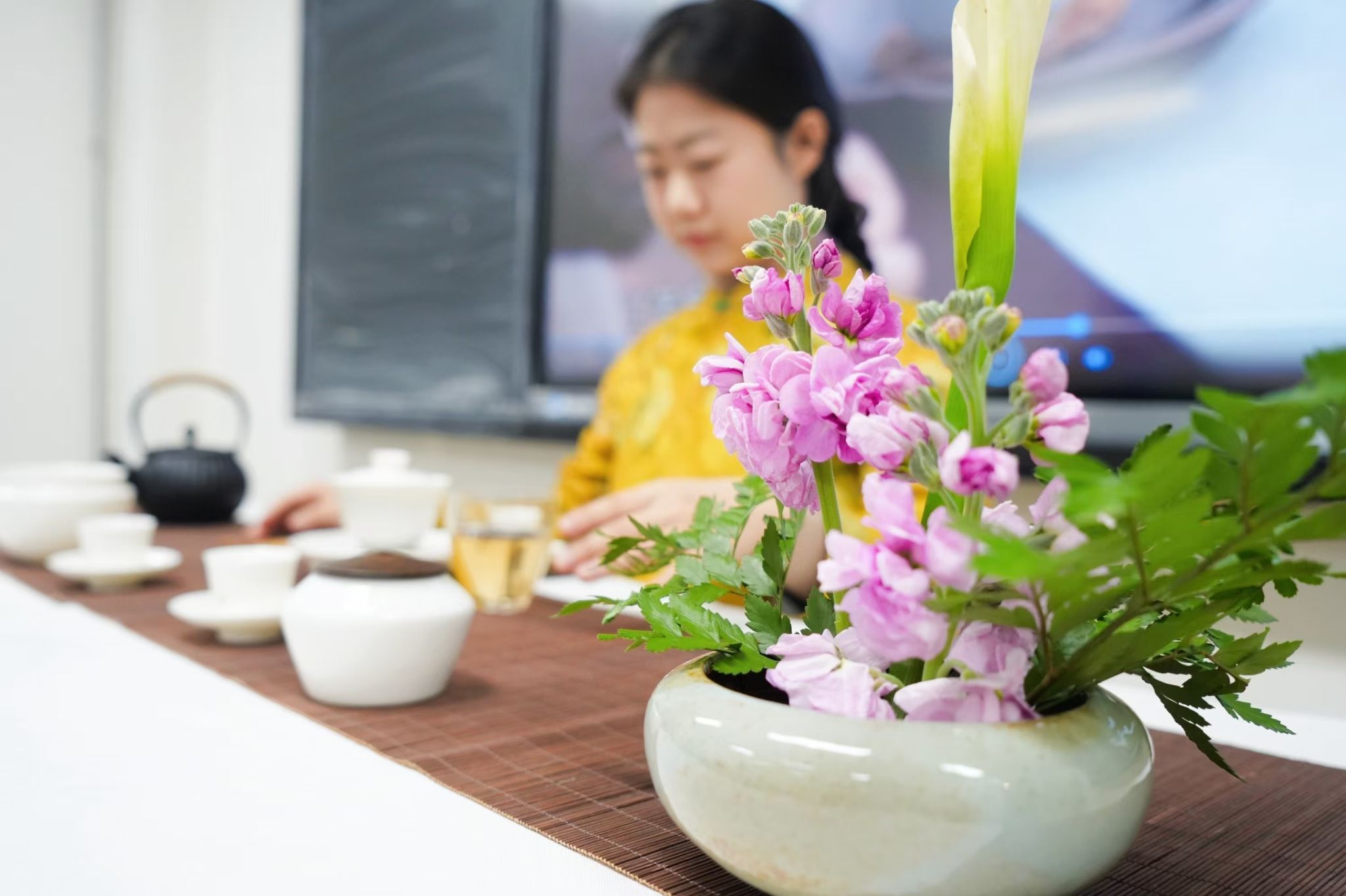 课堂上,韩老师从茶的起源、历史发展、种类、产地分布等多个角度系统地介绍了中国茶文化,并深入浅出地讲解了茶品鉴和茶桌礼仪,包括摆盏净杯、泡茶、品茶、奉茶等具体步骤。通过生动的讲解和互动,老师们不仅了解到“三才盖碗”所蕴含的人与天地和谐共处的哲理,还亲身感受到每一步骤背后深邃的文化内涵和中华礼仪之美。