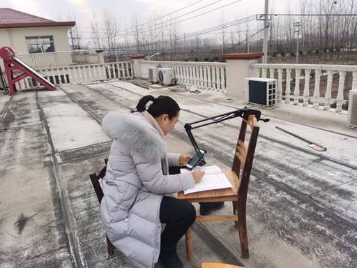 老师们克服一切困难,甚至在农村老家只为寻找网络较好的地方不得不进行“室外教学”,下图为马平老师,冒着严寒在房顶上了一天的课,着实让人感动。在这种精神的感召下,教师们都能积极应对线上教学出现的问题,只为不耽误学生的课程,尽可能优质得将知识传授给同学们。