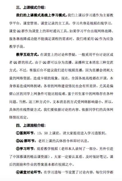 1.在线上教学工作结束后,各位老师认真总结经验,写出课程心得。教学副院长左明刚老师在开课前做了大量的准备工作。以下图片是他就本堂课的流程做的详细的授课心得,并及时发现问题并给出一定的解决方案,以便于在接下来的教学过程中吸取经验,现已向艺术学院广大在线授课教师全面推广。