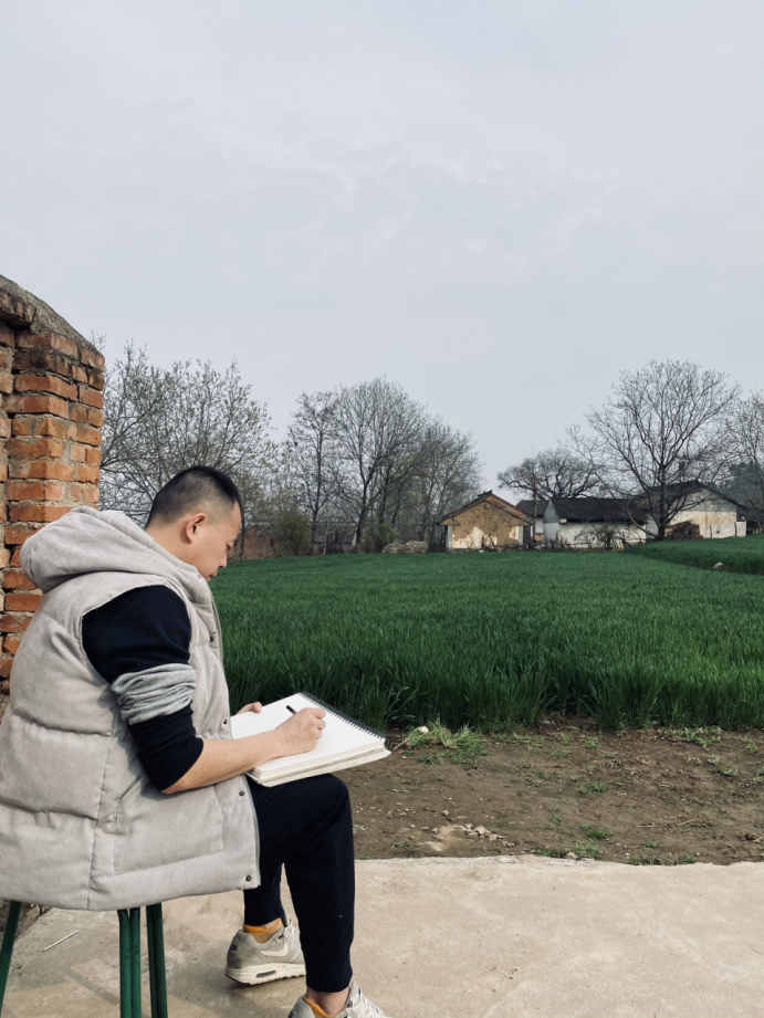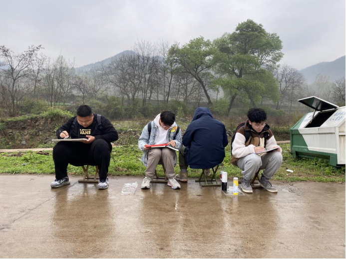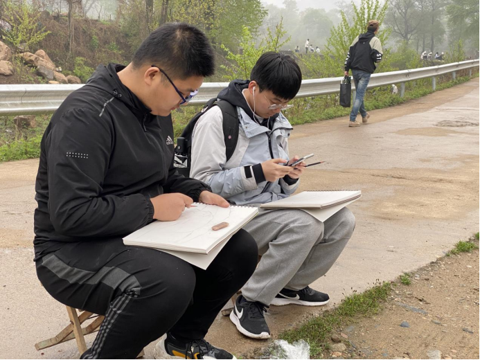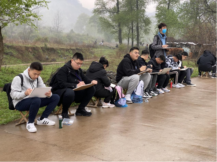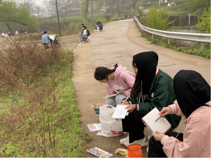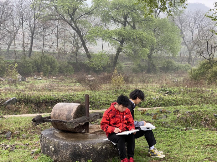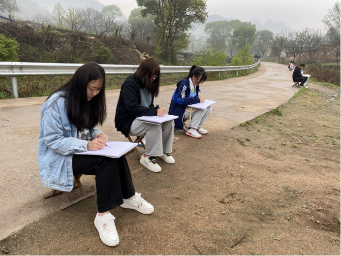 春风和煦,风景优美,朴素的砖墙土墙,简单的建筑方式,随自然而变,生趣盎然体现了村民在长期的山水共存中,发展出的对自然的基本智慧。同学们也深深沉浸在这种自然美景之中,他们三三两两坐下,拿出画笔投入到绘画的热情。希望他们在经历过这一段时间的修行之后,能将这种对绘画的热情转化为学习的兴趣。