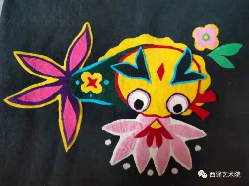 下午在张洁琼老师的介绍下,我们还学习制作了延川布堆画。通过老师讲解,我们了解到布堆画的产生是源于妇女们给孩子衣服打补丁演化而来。随着生活条件的改善,在传统文化的熏陶下,妇女对美的认识领域进一步拓宽,竭力构思他们崇尚繁衍生殖、神灵保佑、吉祥如意的图画,揭示人类产生、生存以及发展变化的奥秘。