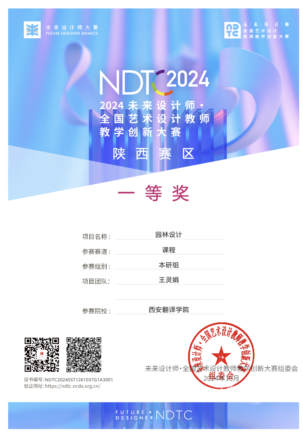 而在所有参赛作品中,王灵娟老师的园林设计课程凭借其出色的教学设计和自然的思政融入,王灵娟老师荣获陕西赛区一等奖,并代表西安翻译学院艺术与设计学院赴现场参加了全国决赛。
