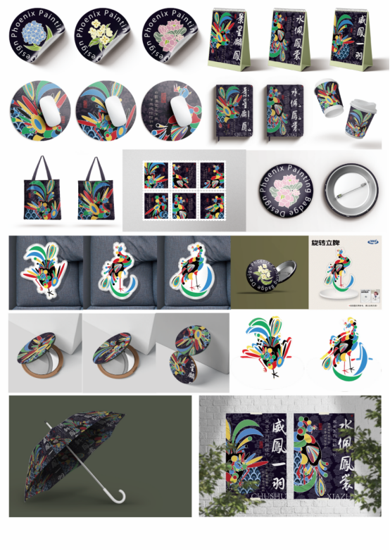 凤画系列招贴设计以凤阳凤画为主要研究对象的招贴设计,通过招贴设计来体现传统凤画与现代招贴的结合,推动凤画品牌建设与发展 。招贴以凤阳凤画中的凤凰作为主体图形,推动凤画传承与创新发展,实现现代招贴设计与传统艺术文化的融合,在向传统学习的同时进行具有创造性的转化,发挥凤阳凤画的心灵休憩以及精神慰藉的作用。招贴以中国五色观中的红色,黄色,蓝色,绿色和黑色为主色,采取传统凤画中单线勾勒的方式用白色在凤画中凸显凤凰颜色的绚丽,表达对美好生活的向往和追求。凤画作为中国传统绘画艺术的瑰宝,蕴含着丰富的民族文化和审美价值;而二十四节气花卉则是中华文化中独特的自然现象和人文景观,具有鲜明的季节特征和文化象征意义,所以将凤画创新与二十四节气花卉融入招贴设计,不仅可以丰富其中的视觉元素,还能提升设计的文化内涵和艺术价值。