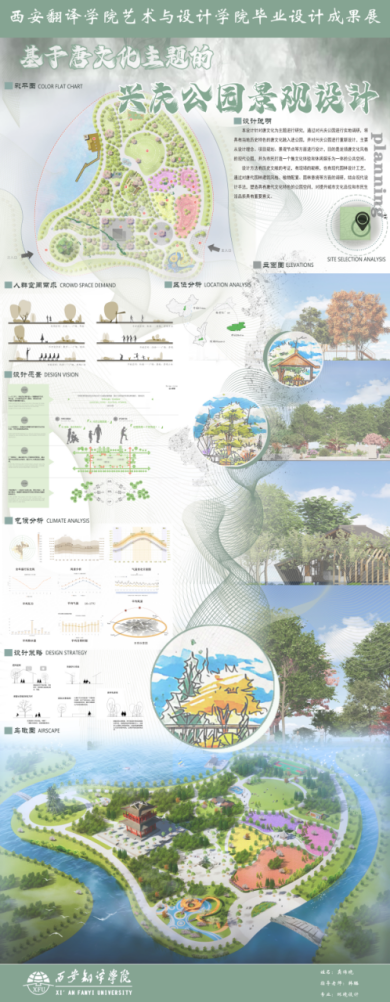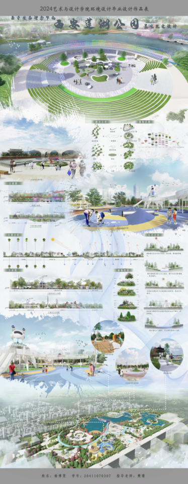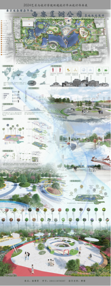 本次设计的是西安莲湖公园,公园位于陕西省西安市莲湖区老城区中,以“莲花”著名,前身是官家的后花园,在1916年正式辟为公园,自此之后逐渐向公众免费公开。设计基于生态理念下,加以新型材料,使莲湖公园符合当下绿色环保的需求,成为一种新型公园,生态一直是属于现当下热门的话题,环境的好坏关乎到人们的健康发展。莲湖区是西安市老龄化人口较为严重的区,老年人口较多,在设计中充分考虑老年人以及其他人群的需求,打造符合人们审美的公园。