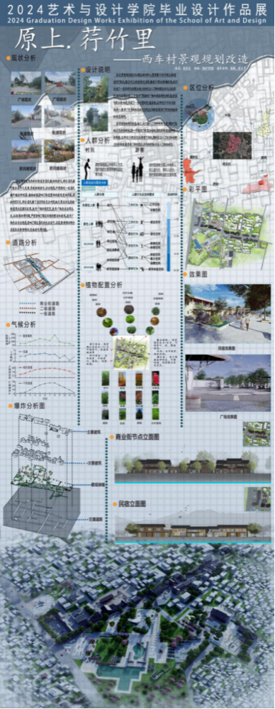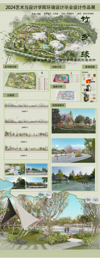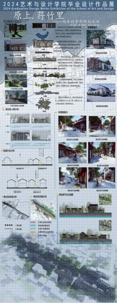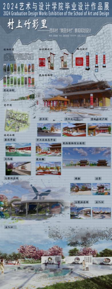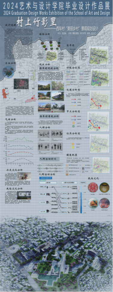 本次设计主要针对乡村景观规划改造展开,在全面分析乡村现状和发展需求的基础上,结合国家政策,以休闲公园改造、民俗文化体验广场设计,民宿改造,商业街改造四个方面为重点,致力于提高乡村环境品质,促进当地经济发展,满足居民和游客的需求。
