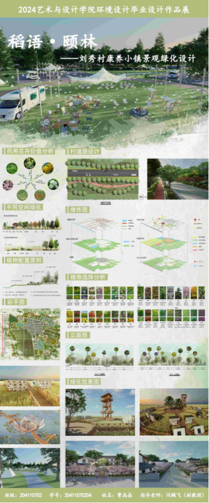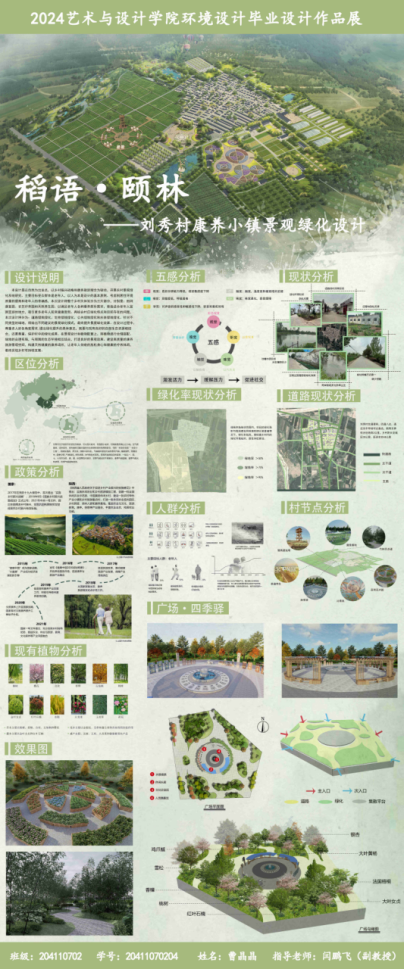 本方案为刘秀村康养小镇景观绿化设计,是以自然为出发点,以乡村振兴战略和康养旅游理念为驱动,主要受众群体是老年人,以人为本是设计的基本原则。在乡村的自然环境资源、人文乡土特色的基础上,以老年人的休闲养老活动为主要内容,考虑到居住环境质量的提高和老年人的幸福感,本次设计将不同绿地分为:道路绿地绿化、宅旁绿地绿化、公共绿地绿化和水体绿地绿化。针对不同类型的绿地,将给出不同建议的景观绿化模式。将整个乡村大体划分为三大功能区,分别是 :田间康复园、农艺疗养园和天然养生园。在原有的基础上改造提升,增加一些具有老年人康养活动的项目,可以让老年人体验村庄的乡土气息,调理老年人的身心健康,吸引更多老年人前来康养度假。
