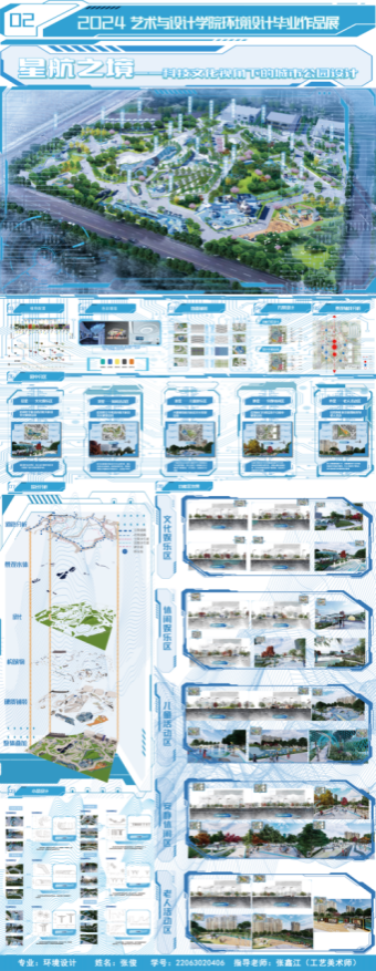 本设计根据西安“三分钟见绿,五分钟见园”的政策要求,意在发展和传承弘扬西安航天科技文化,改善周边环境、串联周边景点,提高科技文化的应用可以提升游客在城市公园中的体验。在多个功能区儿童游乐区,老人休闲,休闲活动区域等通过数字化导览、虚拟现实等技术,游览增强游览的乐趣和教育性,同时科技在城市公园中的应用有助于推动公园的可持续发展。利用可再生能源、智能化节能系统筹技术,为城市公园提供电能,同时让园中游客体验提升,提供便捷性。园中设计语言大量使用折线,矩形等规则线如同电路板一般,起到强引导性,引领游客于园内加强留客能力,发挥场地的科技文化因素,克服城市化对居民生活环境的压迫,利用高新区科技IP,化解本身题材新颖案例较少等问题;考虑过去,立足当前,着眼未来。