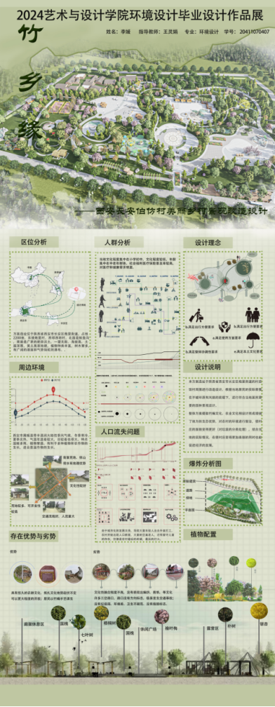 本方案选址于陕西省西安市长安区炮里街道的村史馆村周围进行改造设计,根据当地居民的实际需要,在不破坏原有风貌的前提下,进行符合当地居民需要的园林景观设计。整体方案提取竹编文化、农业文化等元素相设计而成使当地乡村生态环境得到保护和改善,有效的缓解了当地居民的就业问题以及居住条件,使居民的生活质量得到了一定的提高,在设计的过程当中,基于乡村的自然环境资源和经济发展水平等多方面的因素,以当地特有的自然及人文环境为中心,从村落的原生态形态出发,持续地对节点元素、空间肌理、景观材料等进行深度的挖掘,从而构建出乡村聚落的温暖模式。在保护好乡村原有的传统文化基础框架上,根据当地实际情况,对乡村进行规划,将乡村风貌与现代风貌相结合,并通过植物搭配,将村庄的街巷串联起来,形成居民的休闲空间。