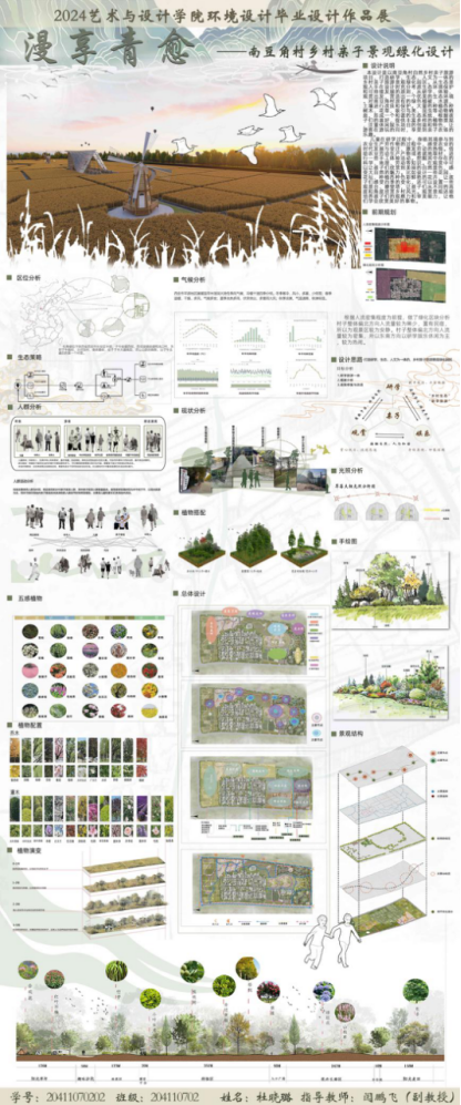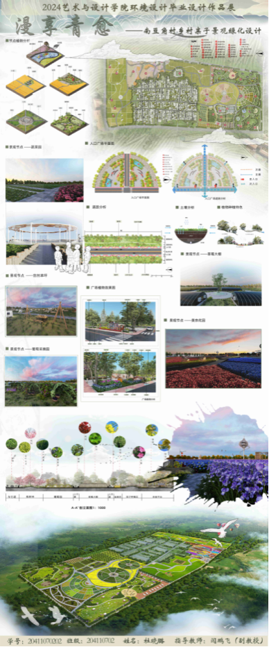 以亲子体验为核心的南豆角村田园综合体总体规划设计以观赏、研学体验、休闲娱乐出发,分为六块功能区。植物种植上,打造绿色自然空间,充分利用乡村自然元素,如树木、草地、农作物等因造出自然而然的童趣氛围。在铺装上面,保证质量的前提下运用了彩色搭配,在视觉上吸引儿童好奇心于注意力。观赏方面:有金色麦浪和莫奈花园,呈现出乡村田园的独特韵味,营造出质朴、纯真的氛围,增添景观的自然气息和野趣。研学体验:有蔬菜种植、采摘园和牧场喂养园,农作物的株高低错落,可形成独特的景观层次,使景观更具立体感和丰富度,展现了一种生态的、可持续的景观特色,与自然环境相融合,体现人与自然和谐共处的理念。休闲娱乐:有悠然草坪和趣味麦田,是亲子共同游玩的好地方,增进亲子间的情感交流和互动,可以放松身心,缓解压力,享受宁静时光。