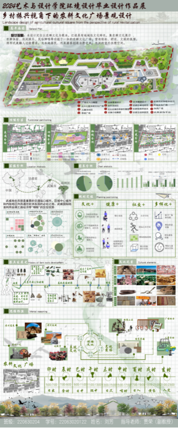 本设计定位以农耕文化为根本,集灯山村传统农业技艺、农耕节庆活动、农耕文化展示 、农耕体验、休闲娱乐、民俗弹唱等功能于一体的农耕文化广场。利用灯山村民俗文化与农耕文化相结合的景观表达手法,满足农耕文化展现的同时,与民俗文化更好的融合,打造出在游览风景的同时,传播当地的民俗文化与民俗活动。营造轻松、舒适、文娱的氛围,将形式美融入功能需求,为本地居民、外来游客创造自然优美,休闲的室外休憩空间。