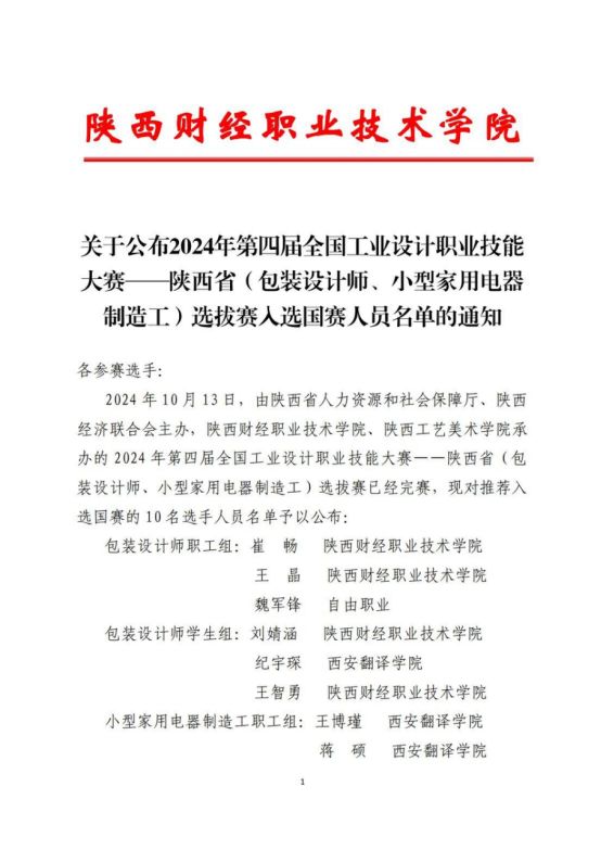近日,由陕西省人力资源和社会保障厅、陕西经济联合会主办,陕西财经职业技术学院、陕西工艺美术学院承办的2024年第四届全国工业设计职业技能大赛——陕西省(包装设计师、小型家用电器制造工)选拔赛圆满落幕,进入国赛的名单进行公布。