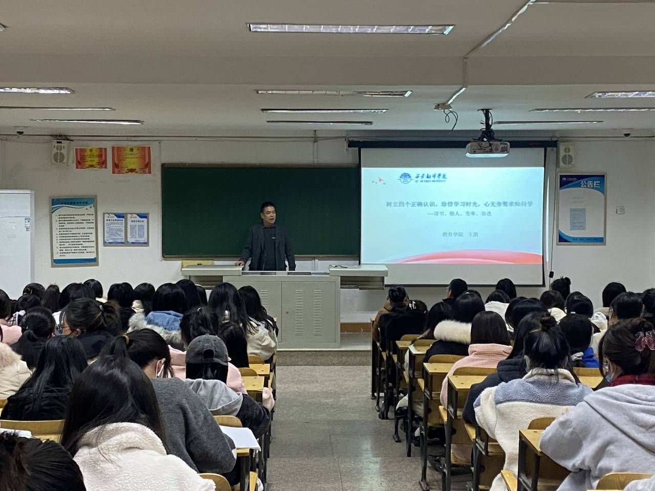 为了贯彻落实我校学工部《关于开展“请党放心,强国有我”践行活动的通知》和《进一步加强学风建设的通知》工作要求,12月5日晚19:00,教育学院于8416L教室开展“树立四个正确认识,珍惜学习时光,心无旁骛求知问学——读书、做人、变革、奋进”为主题的学风建设专题讲座。教育学院辅导员薛蓉、傅丹丹、范春利、韩维、刘正安、王凯、王惠兰、赵云侠,19级学前、小学教育本科及20级学前教育本科学生代表参加本次讲座。本次讲座由教育学院辅导员刘正安主持,教育学院辅导员王凯主讲。