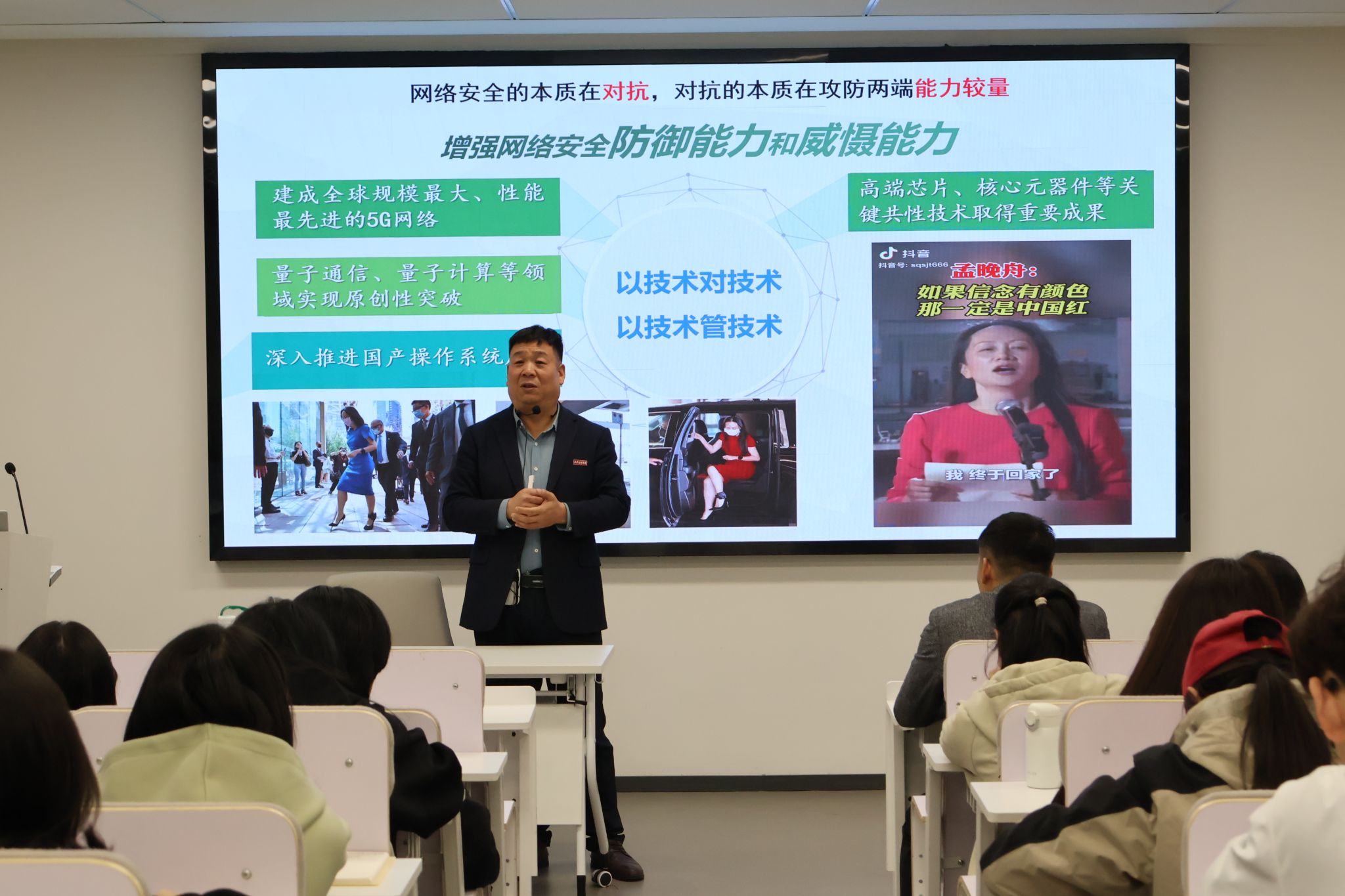 会上刘联军老师就新时代国家总体安全观的主要内容从政治安全、经济安全、军事安全、文化安全等多个维度,深入浅出地阐述了国家安全的重要性和紧迫性,并结合具体案例,分析了当前国家安全面临的复杂形势和严峻挑战。讲座内容丰富、生动有趣,赢得了在场师生的阵阵掌声。