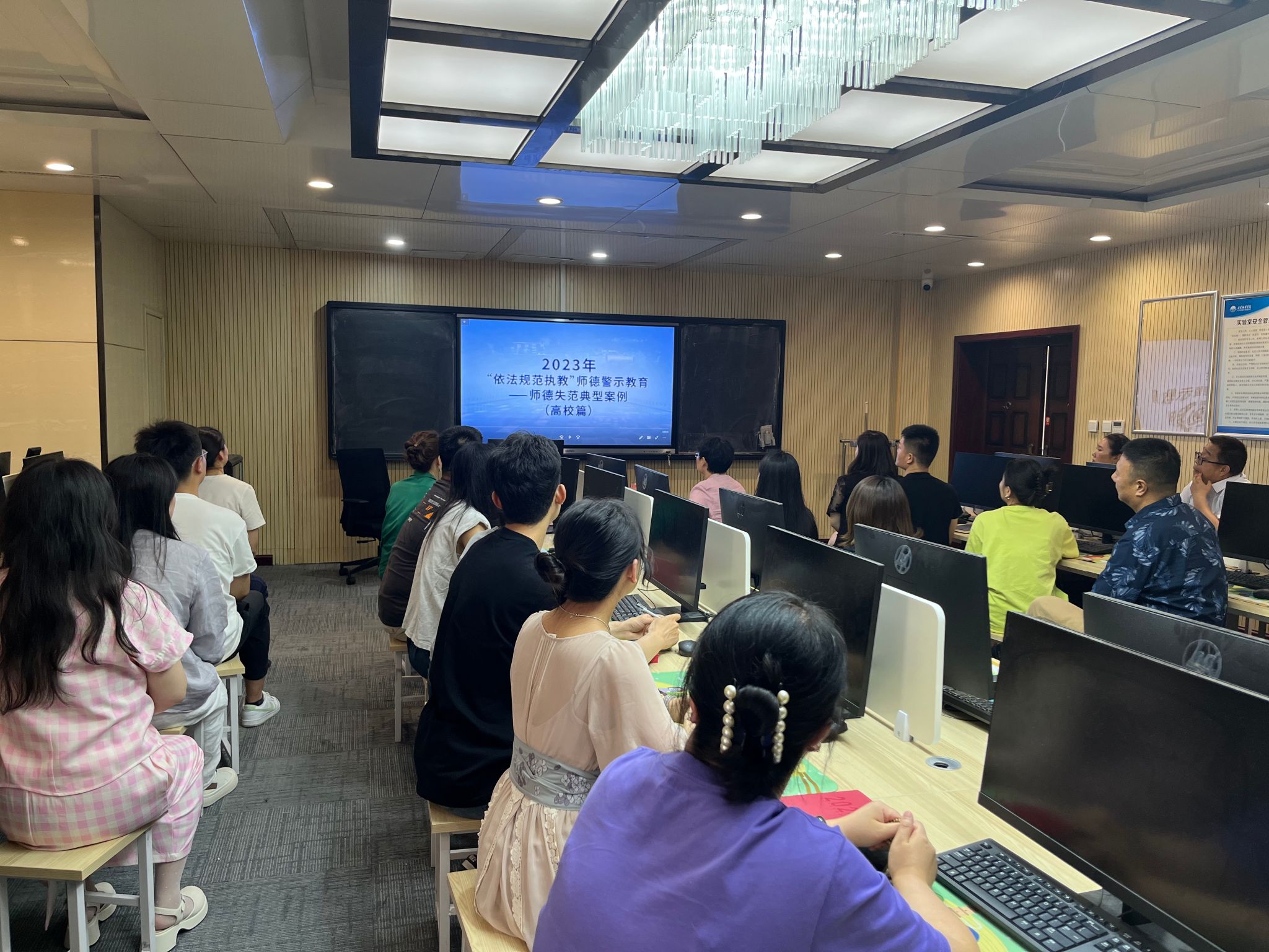 全体支部党员学习《2023年“依法规范执教”师德警示教育——师德失范典型案例(高校片)》教育警示片。主要学习《新时代高校教师职业行为十项准则》以及高校教师在课堂上、网络上发布、转发错误言论;学术不端;要求学生从事与教学、科研、社会服务无关的事宜;性骚扰学生;私自收取侵占学生学费等问题,以及对每一个案件做出党纪处分。
