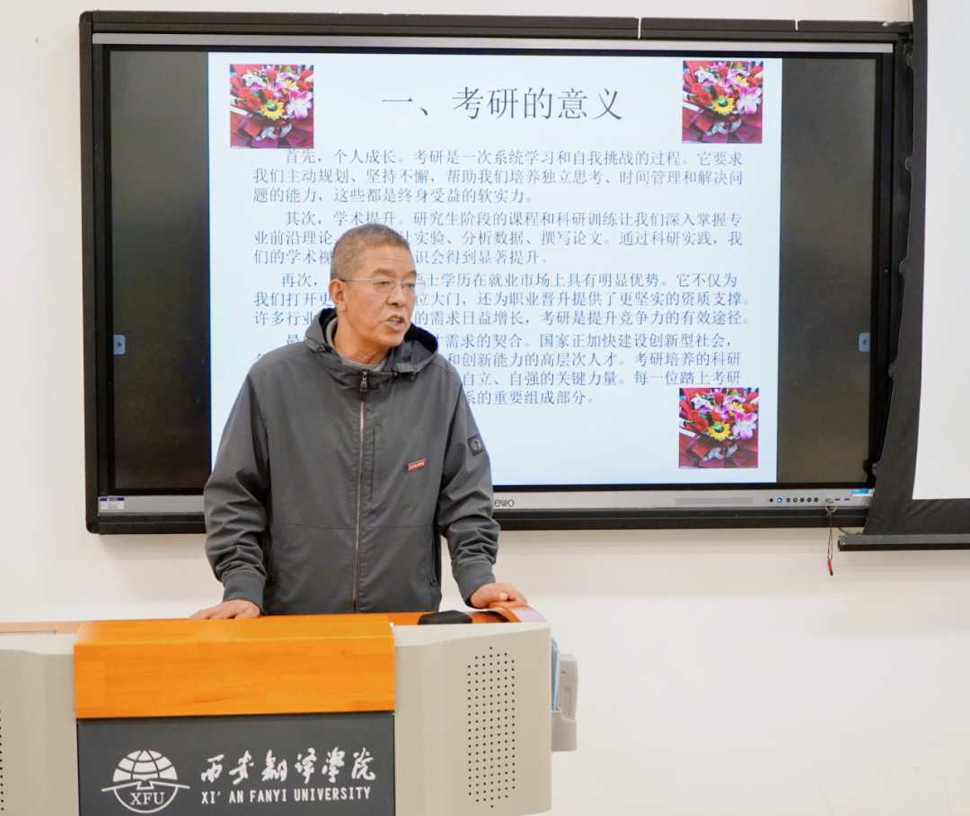 随后,兰院长围绕“考研为何、如何备考”展开核心分享。在“考研的意义”部分,他从四个维度进行解读:一是个人成长,考研能锻炼自主学习、抗压能力,帮助学子突破认知边界;二是学术提升,为对专业领域有深入探索意愿的同学提供系统学习平台,夯实学术基础;三是职业发展,拓宽就业选择面,为进入更高层次岗位或专业领域工作奠定基础;四是契合国家需求,响应国家对创新型、高素质人才的召唤,将个人理想与国家发展紧密结合。