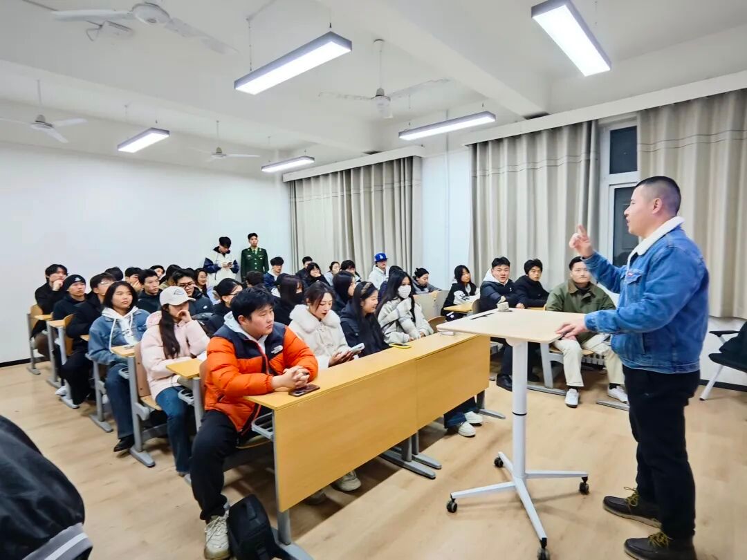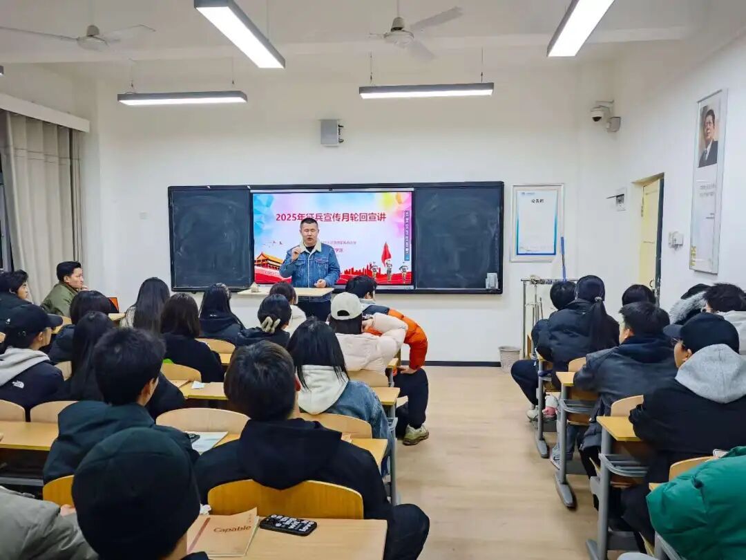 在福利待遇与军队生活介绍中,陈忠毅老师结合自身工作经验,用生动的讲述为学子们展现了军营的真实面貌。他从薪资津贴、医疗保障、住房补贴等福利待遇,谈到军队的日常训练、文化生活、个人成长,既客观阐述了军营生活的纪律性与挑战性,也强调了军队对青年意志品质、综合能力的锤炼作用。“军队是一所培养人才的大学校,在这里不仅能收获强健的体魄和坚定的意志,更能学到实用技能,为未来人生道路奠定坚实基础。”陈老师的话语让在场学子对军营生活充满向往。互动环节中,学子们踊跃提问,就入伍年龄限制、专业适配岗位、退役后发展路径等问题与陈老师深入交流,陈老师逐一耐心解答,为学子们消除了后顾之忧。