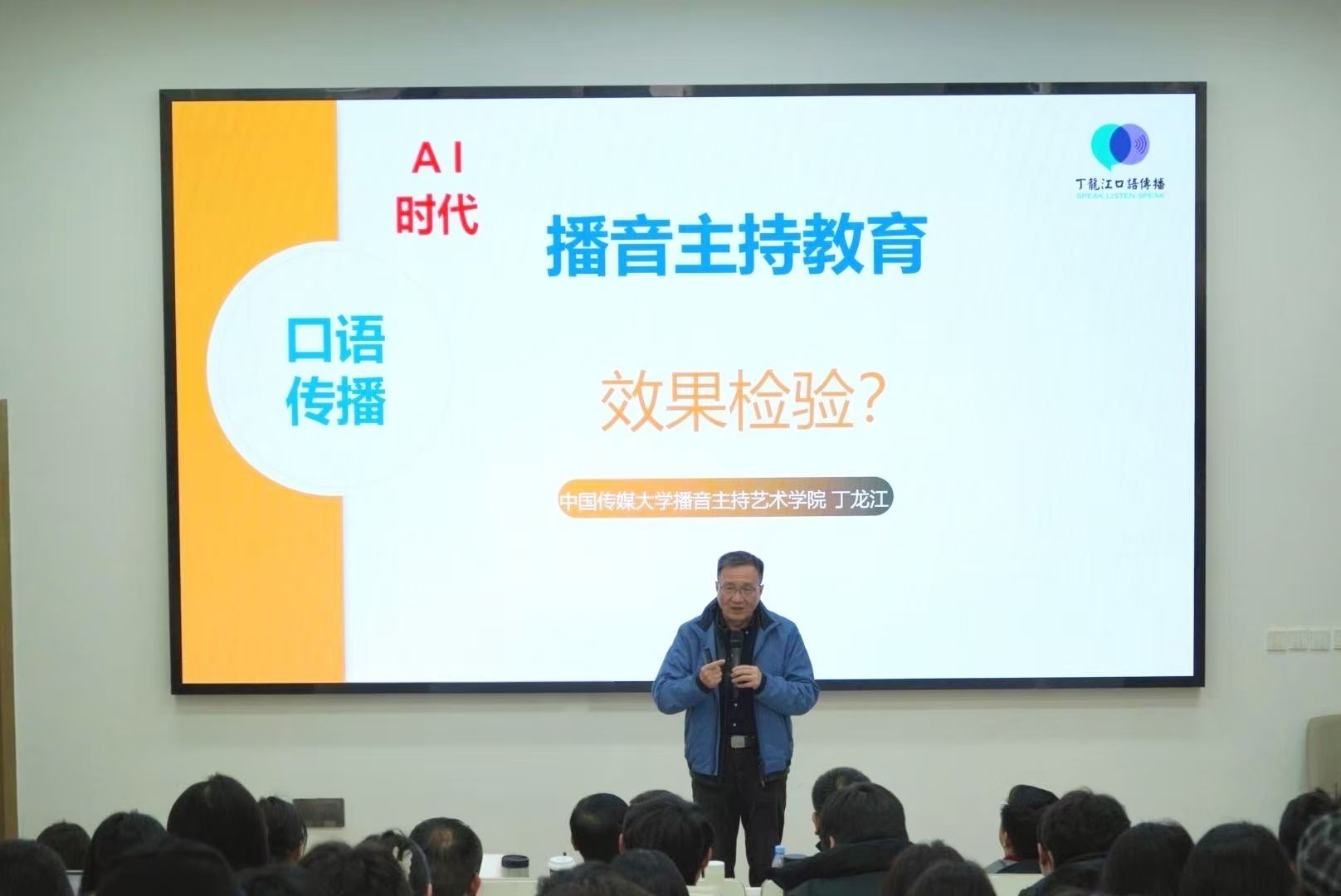 讲座伊始,丁龙江教授以自身丰富的行业实践与教学经验为切入点,直指当前播音主持教育面临的时代困境。他指出,在AI技术飞速发展、媒体形态持续迭代的今天,传统播音主持教育存在知识体系更新滞后、实践训练模式固化、应对行业变化能力不足等问题,“如果再不抓住所有可能性往前快速奔跑,播音与主持艺术专业未来堪忧”。这番话既点出了播音与主持艺术专业发展的紧迫形势,也引发了在场师生的深度思考。