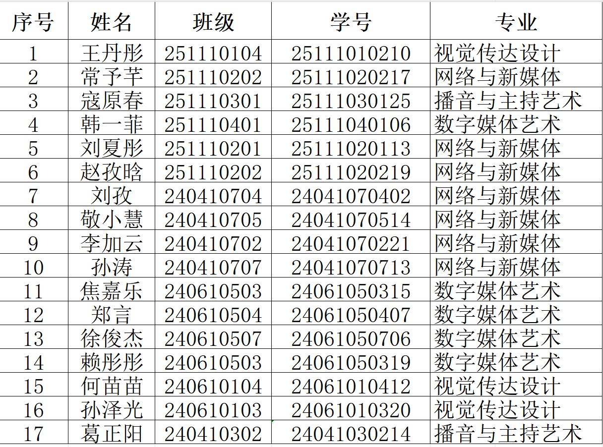 为进一步弘扬“学在西译”良好学风,深入践行“读书、做人、变革、奋进”校训精神,促进学生全面发展,依据《西安翻译学院“晨读晨练之星”评选奖励办法(试行)》(西译院发〔2024〕98号)的通知,凤凰数智传媒产业学院开展了2025年10月份“晨读晨练”之星评选,决定授予王丹彤等17名同学为“晨读晨练之星”(10月份)。