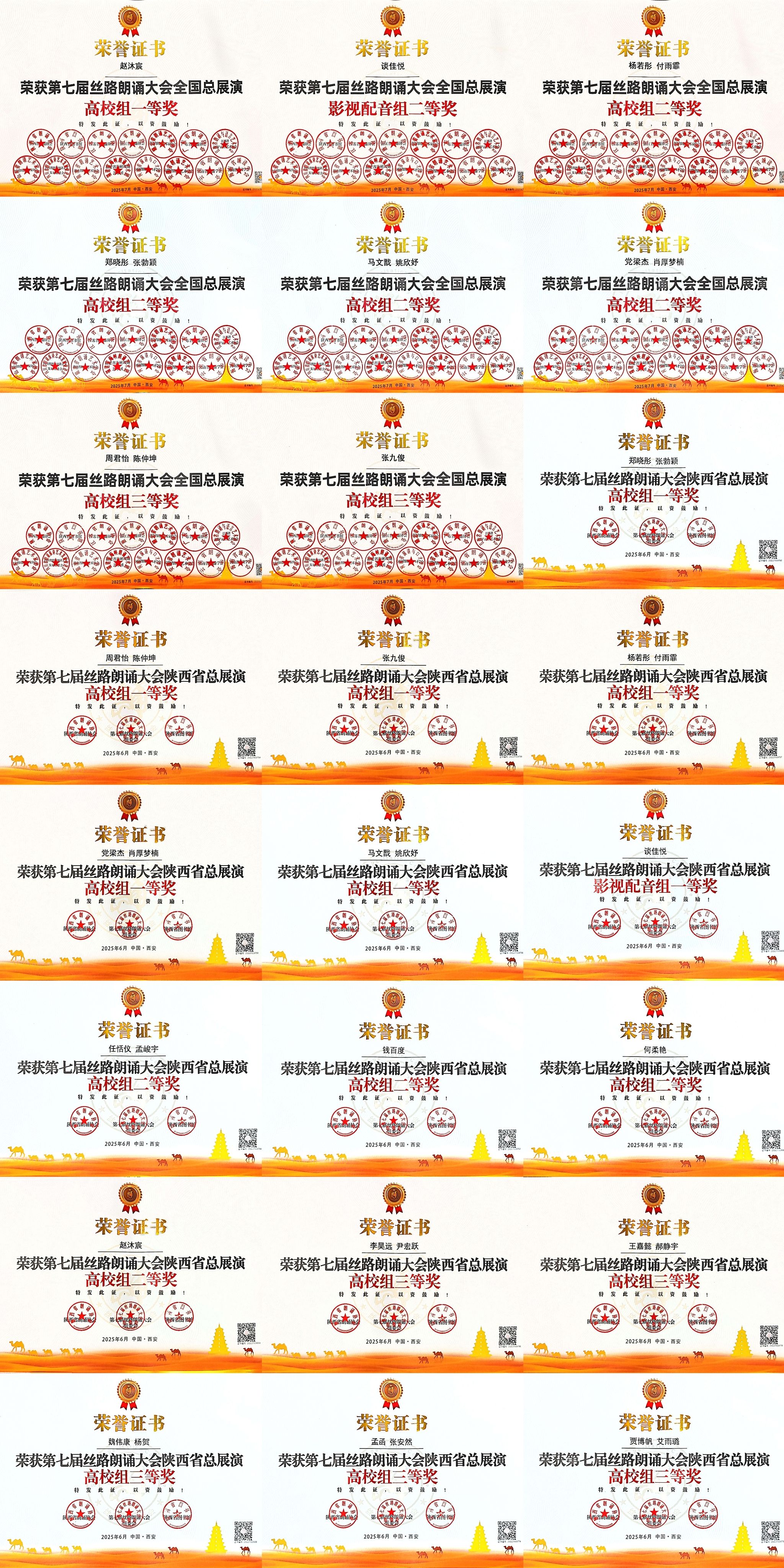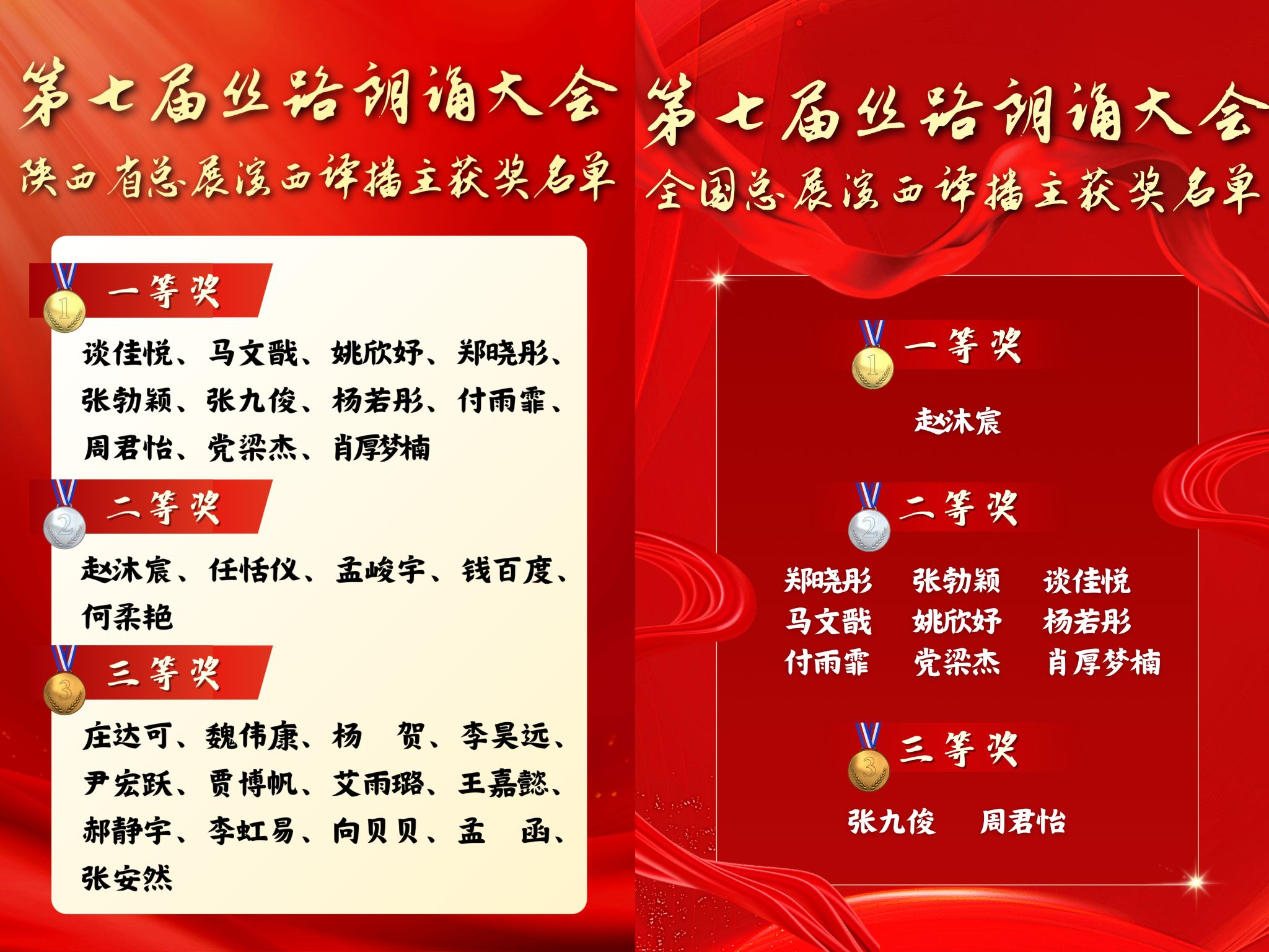 今年端午期间,第七届丝路朗诵大会陕西省总展演在西安国际会议中心隆重举行。比赛现场,西译播主学子围绕丝路文化、家国情怀、青春理想等主题,以声传情、以诵言志,演绎了《城南旧事》《不朽》《秦韵》等经典篇目。选手们或慷慨激昂,或婉转悠扬,展现出高超的诵读技巧和富有张力的舞台表现力。最终,谈佳悦等11名学生荣获一等奖,任恬仪等5名学生获二等奖,庄达可等13名学生获三等奖。