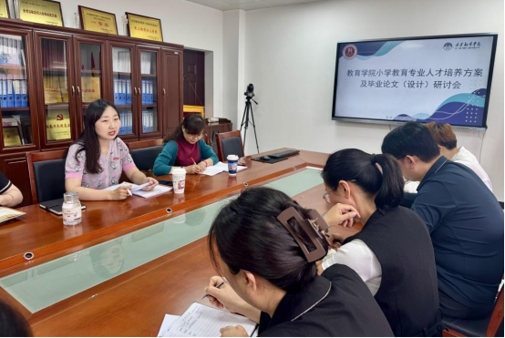 为进一步推进师范专业认证工作,深化小学教育专业人才培养模式改革,全面提升人才培养质量,培养适应新时代基础教育需求的高素质小学教师,2025年5月14日上午,教育学院小学教育系在 8号楼二楼会议室召开了小学教育专业人才培养方案及毕业论文(设计)研讨会。会议邀请了宝鸡文理学院附属学校正高级教师安瑛,教育学院院长助理王鹏,携手小学教育系骨干教师,共同为小学教育专业的发展出谋划策。会议由小学教育系主任杜赟主持。