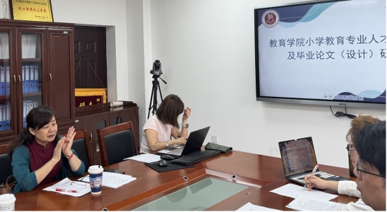 在毕业论文(设计)论证研讨环节,对于将毕业设计从纯论文转变为“教学设计+实施反思+成果展示”的多元组合形式,安瑛老师给予了高度认可。她指出,这种形式能够更好地覆盖小学教学中的关键需求,如教学设计能力、教学实施能力以及教学反思能力等,为拓宽实践领域,建议加入“主题活动设计”相关内容。为确保学生结合实习经历完成毕业设计并深度落实反思,杜赟老师指出要建立更加完善的指导机制,加强对学生实习过程的跟踪指导。同时,老师们还对当前方案的评价标准进行了细致分析,提出了合理的优化建议。