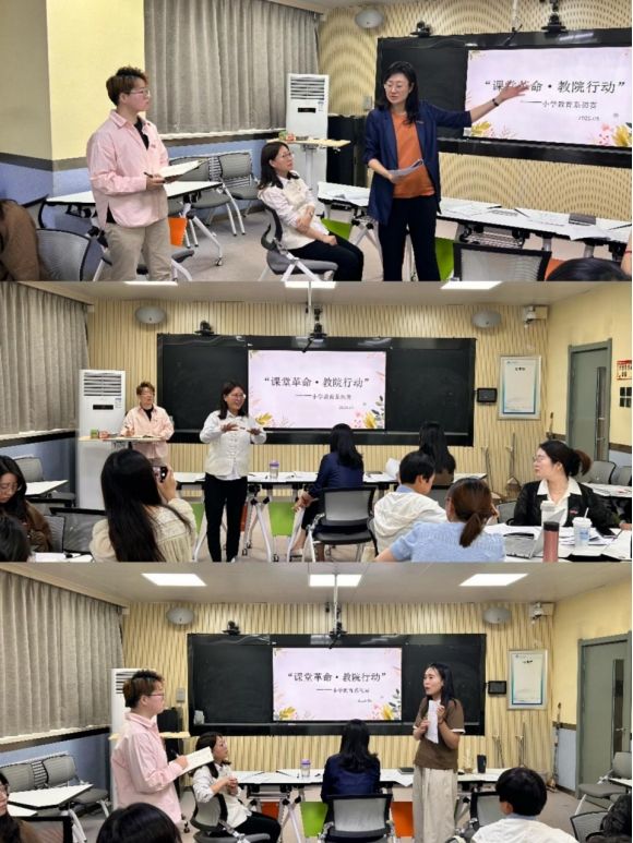 课堂教学是人才培养的主渠道和主阵地,为贯彻落实教育学院“课堂革命·教院行动”实施方案要求,扎实推进课堂教学改革,提升教师教学水平,小学教育系于2025年5月7日在8310教室举办了“课堂革命·教院行动”初赛。本次比赛邀请小学教育系庞钊珺教授、阎涛副教授、裴菁菁副教授担任评委,全系教师参与观摩与研讨。