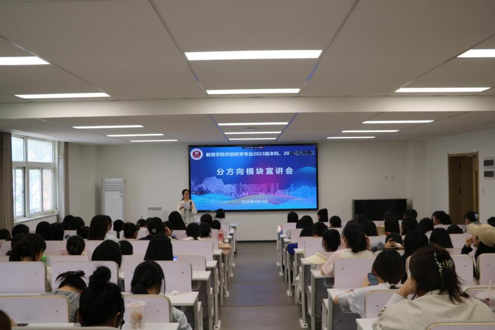 为协助学前教育专业的学生深入了解专业发展路径,确立未来职业生涯规划,2025年4月16日中午学前教育系在8号楼学术报告厅成功召开了2023级本科、2024级专升本学前教育专业分方向宣讲会。会议由学前教育系教师白晓竹主持,学前教育系主任黄玉芳、专职教师王静、辅导员闫玉虎和马玥璐等出席,学前教育专业2023级本科、2024级专升本全体学生线下、线上同步参会。此次宣讲会围绕幼儿体能、婴幼儿照护和幼儿艺术三大模块展开,特邀体育学院专职教师刘彦琴、教育学院美育教学中心教师胡媛媛以及学前教育系专职教师李玥桥,为同学们进行深入细致的解读。