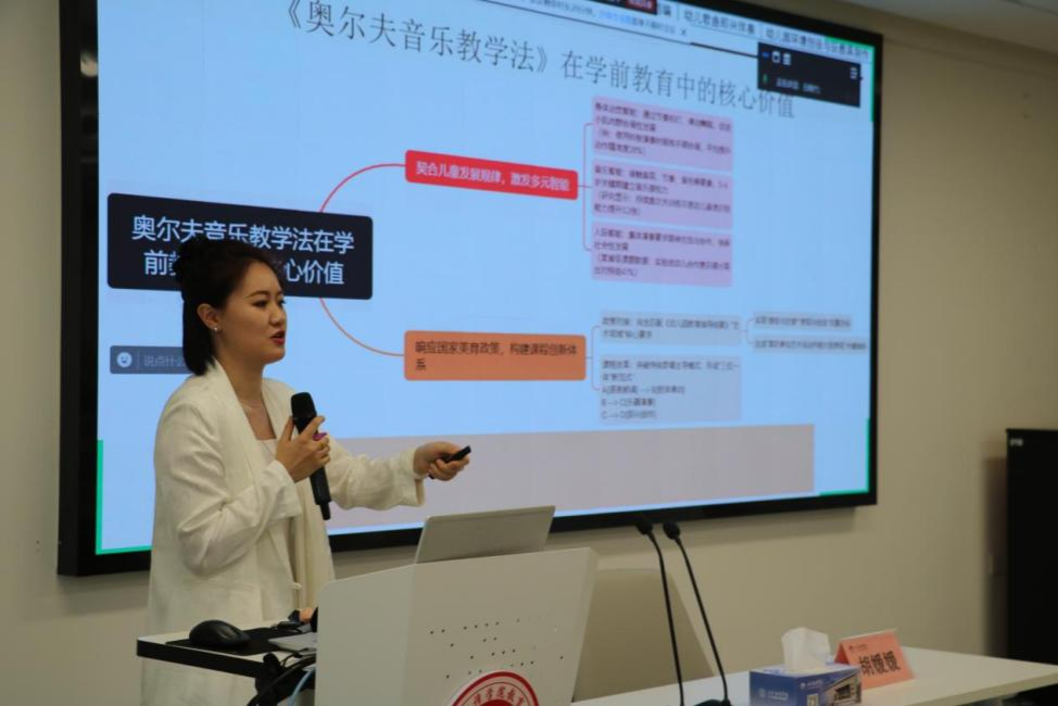 胡媛媛老师对幼儿艺术模块的奥尔夫音乐教学法、幼儿舞蹈创编、幼儿歌曲即兴伴奏、幼儿园环境创设与玩教具制作四门课程进行了详细介绍,深入阐释其在学前教育中的核心价值。胡老师强调艺术教育不仅是美的传递,更是国家政策的风向标、职业发展的加速器以及幼儿成长的核心竞争力。