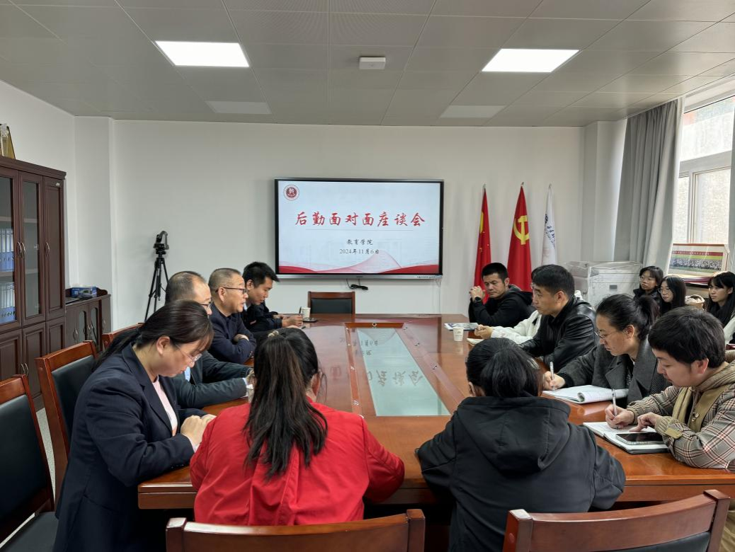 2024年11月6日,为进一步加强学校后勤管理和服务水平,全力保障教育教学工作的开展,后勤集团与教育学院共同举办了“后勤面对面”座谈会。此次座谈会邀请了后勤集团多个部门的负责人、教育学院综合办副主任潘亮亮、教育学院辅导员代表及学生代表参加。