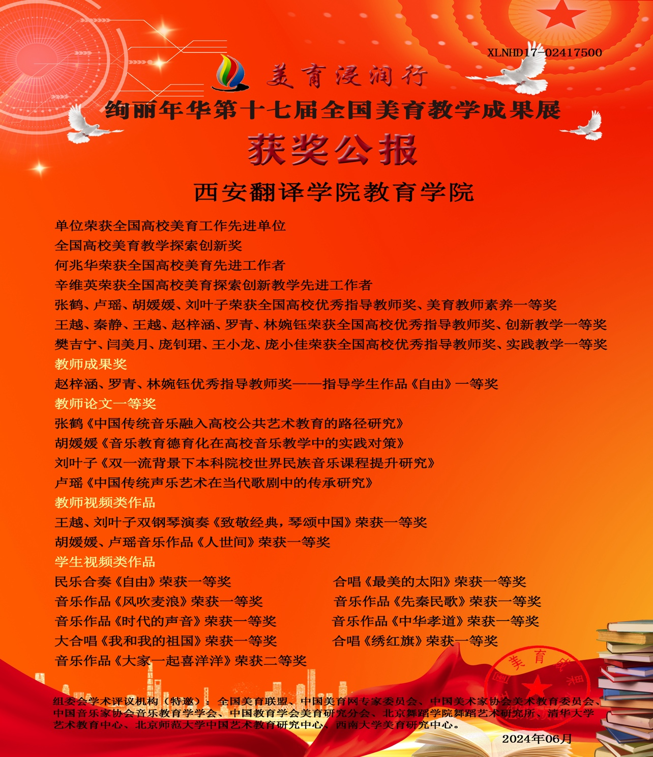 为认真贯彻中办、国办《关于全面加强和改进新时代学校美育工作的意见》、教育部《关于切实加强新时代高等学校美育工作的意见》和《教育部关于全面实施学校美育浸润行动的通知》,强调美育是传承中华文明的重要方式,做实美育具有陶冶情操、温润心灵、激发创新创造活力的价值,把美育纳入高等学校人才培养全过程贯穿在人才培养的全部过程。西安翻译学院教育学院美育教学中心特组织师生参加“美育浸润行—绚丽年华”第十七届全国高校美育教学成果展并取得了骄人的成绩。