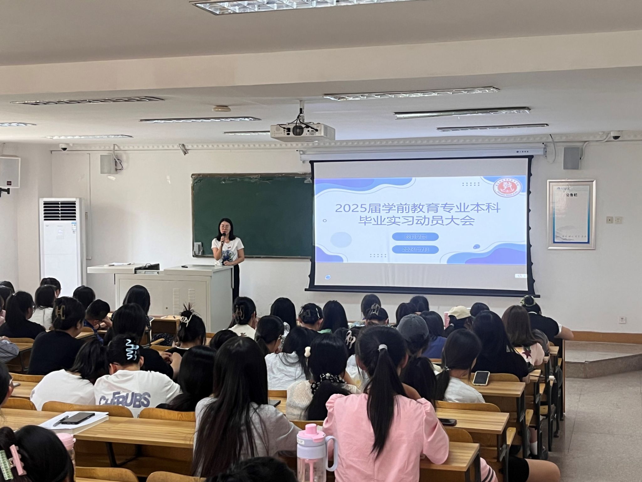 为切实规范学前教育专业毕业实习工作,增强教育实践育人价值,进一步落实“学生中心、产出导向”理念,学前教育系于2024年7月2日12:30在八号楼8316教室召开2025届本科学前教育专业毕业实习动员大会。教育学院综合办主任刘正安、综合办副主任张改宁、学前教育系主任黄玉芳、学前教育系副主任杜赟、美育教学中心副主任赵梓涵、学前教育系全体教师和全体学生参加了此次大会,大会由王聪老师主持。