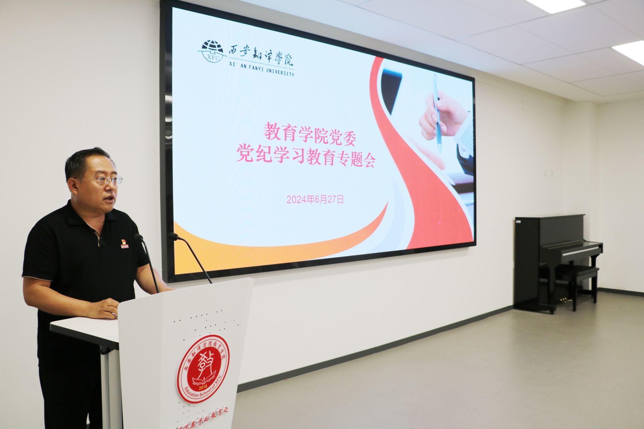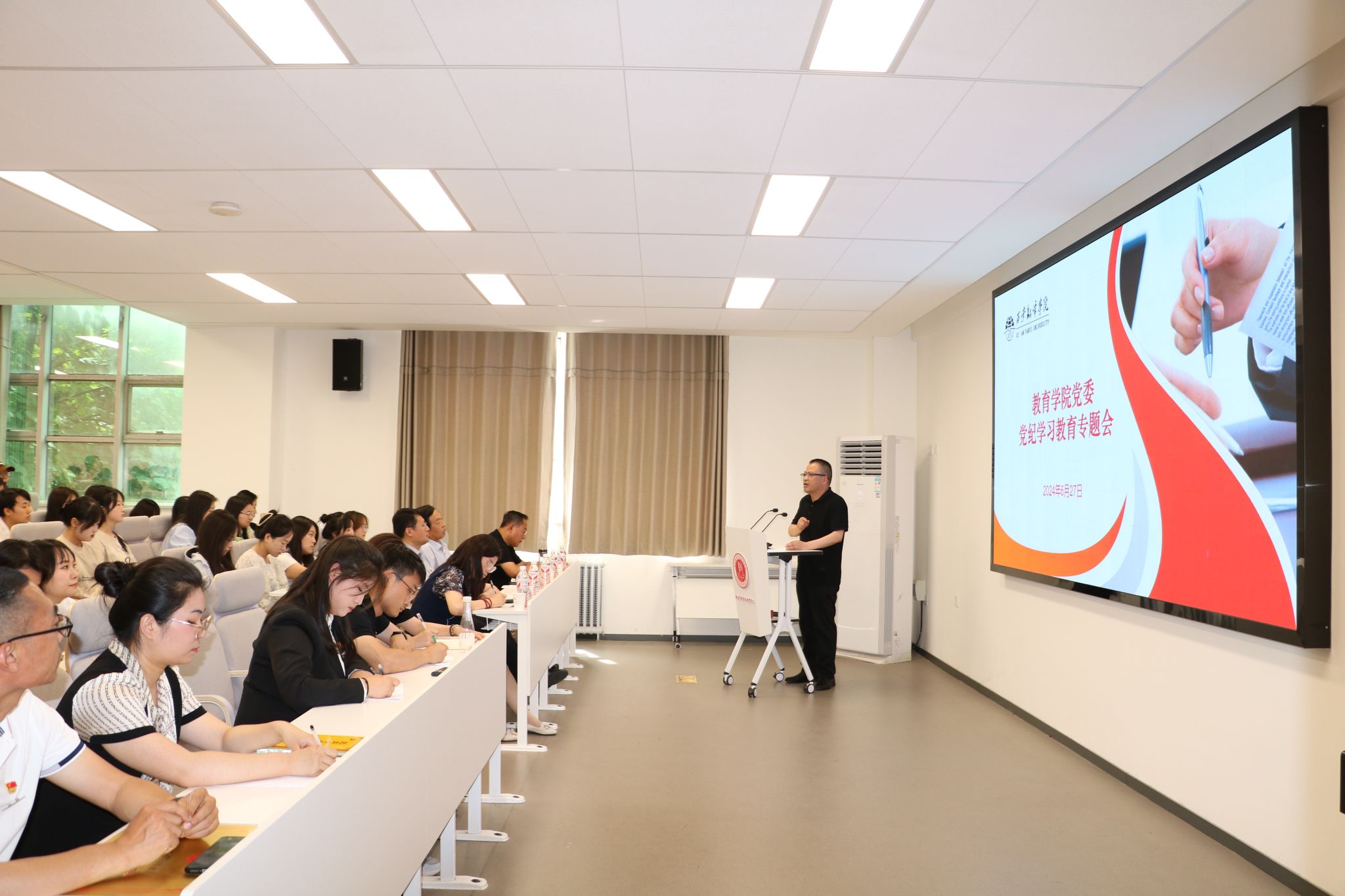 为了深入贯彻落实习近平总书记关于全面从严治党的重要指示精神,进一步加强党员的党性教育和纪律意识,扎实推进党纪学习教育走深走实。6月27日下午,教育学院党委在八号楼二楼学术报告厅召开了党纪学习教育专题会。校党委书记栾宏,校纪委书记马向阳,校党委组织部部长李雪莹出席会议。教育学院党政领导班子及全体师生党员参加会议。会议由学院党委书记、副院长王小龙主持。