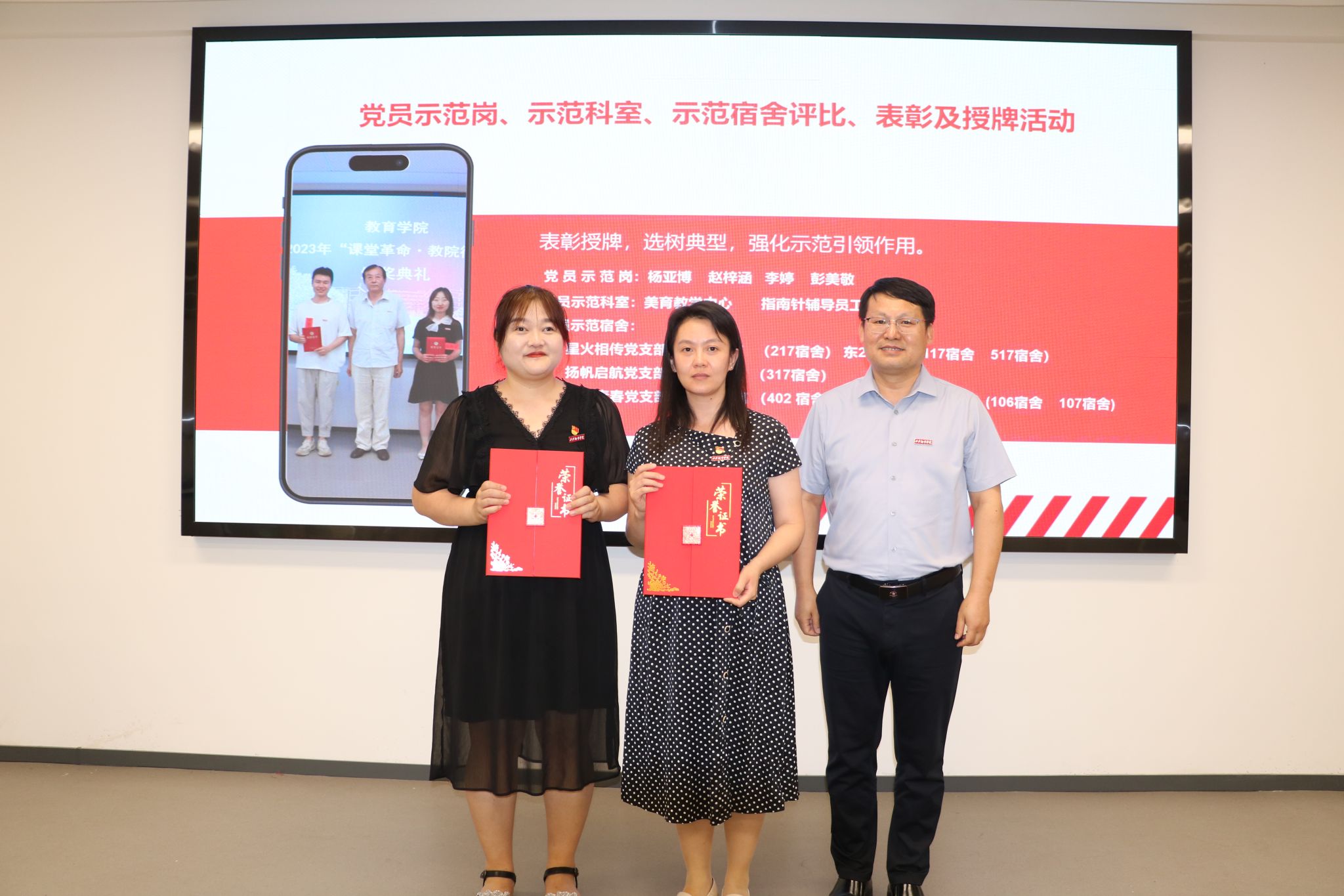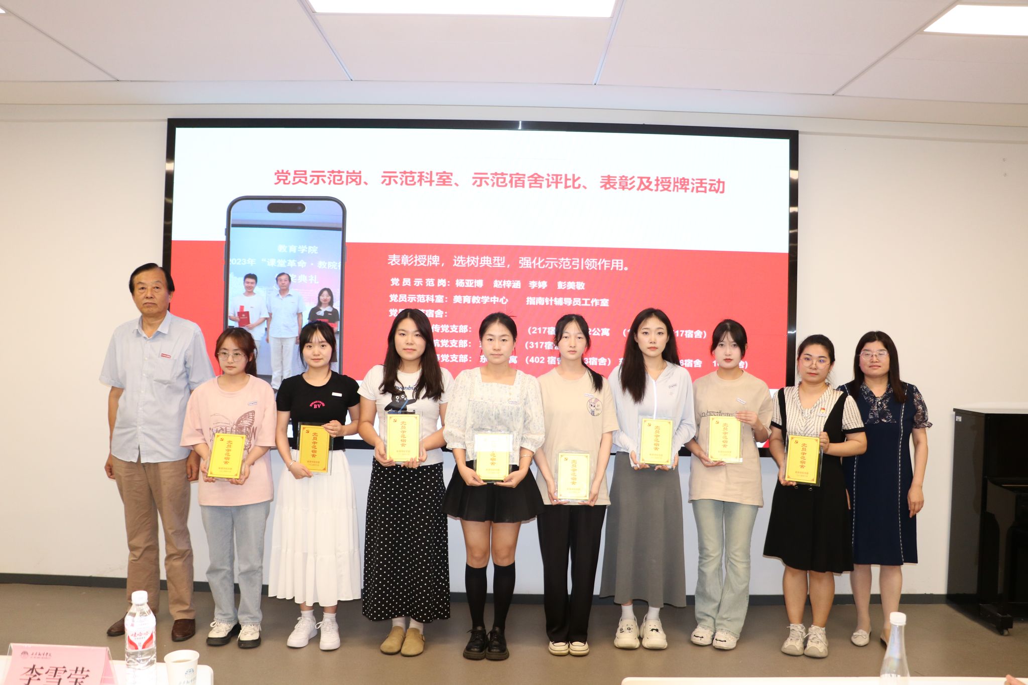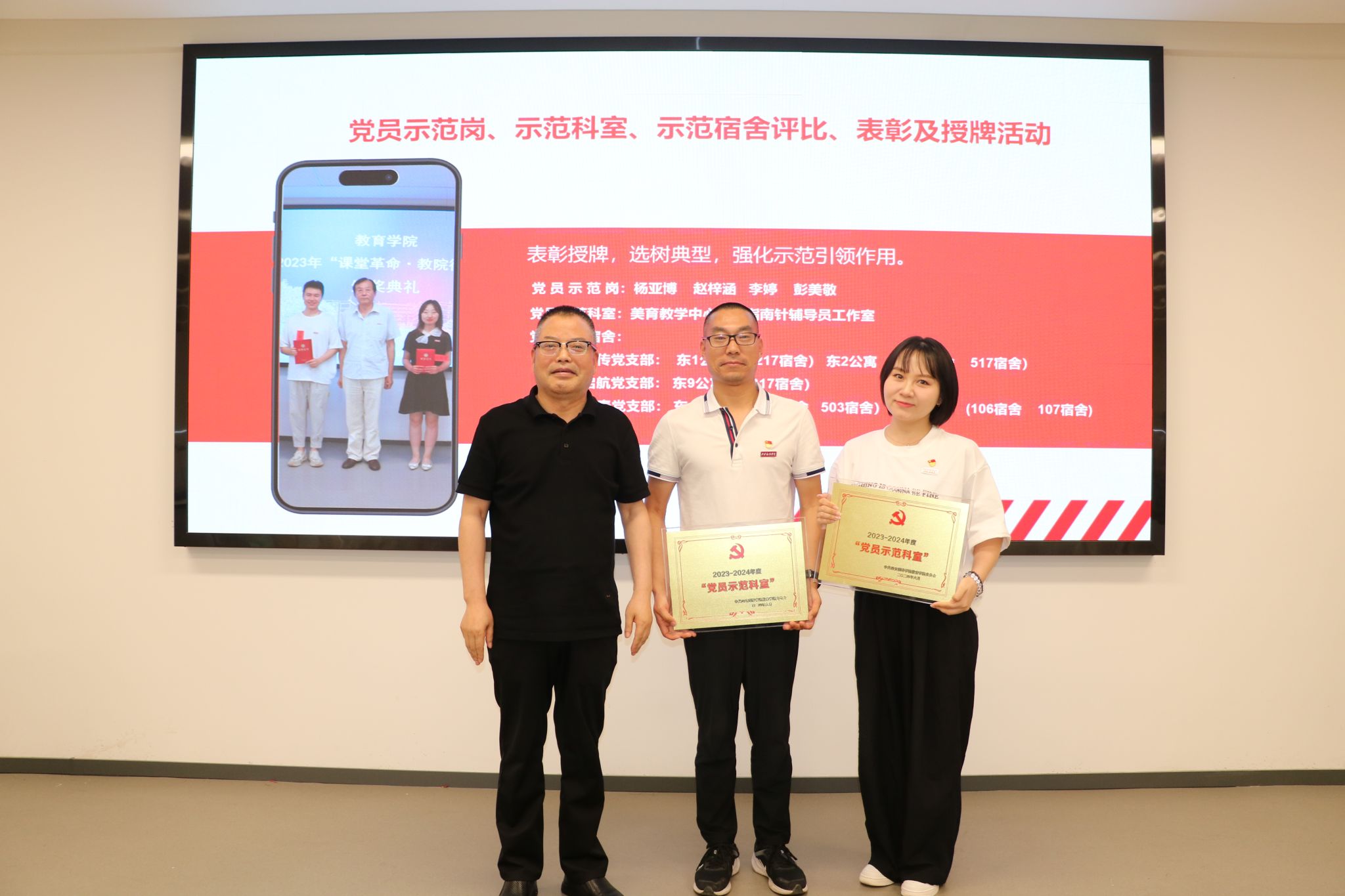 随后,王小龙通报了党员示范岗、示范科室以及示范宿舍评比情况之后,会上一并举行了表彰授牌活动。经过严格的评选,一批在党纪学习教育以及“一站式”学生社区建设中表现突出的先进集体和优秀党员获得了表彰。领导们为他们颁发了荣誉证书和奖牌,并鼓励他们继续发挥模范带头作用,为推动学院的党风廉政建设和事业发展贡献力量。