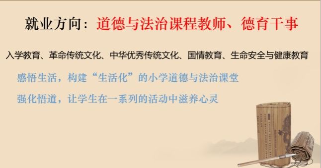 道德与法治模块的宣讲教师张潇文从三个方面介绍了本模块的学习内容:什么是道德与法治课程,道德与法治课程的内容以及道德与法治模块学习的就业前景。张老师提到:立德树人是育人的根本,道德与法治模块课程的学习会让学生更加深刻的体会到教育的崇高、教育的核心以及教育的价值,该方向多样化的课程设置也会让学生在学习中有所悟道。