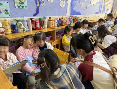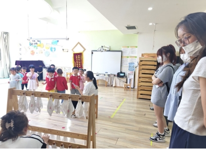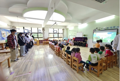 在分小组深入幼儿班级实地参观环节,学生们主动融入了幼儿的游戏,与幼儿亲近并充分互动,亲身参与并体验了幼儿园教育的指导过程。