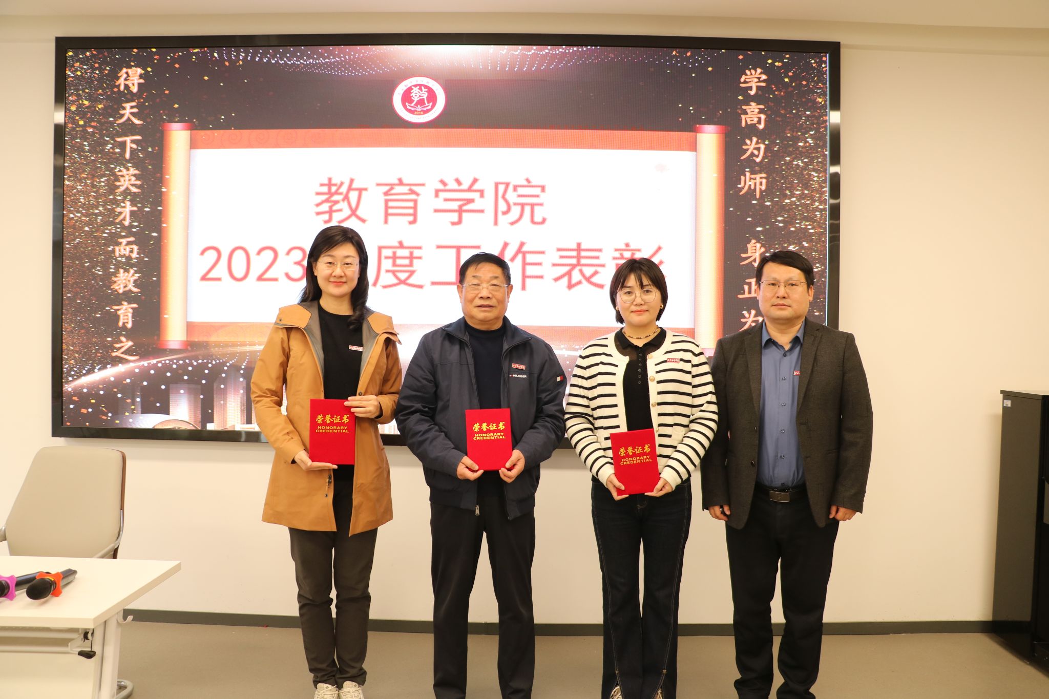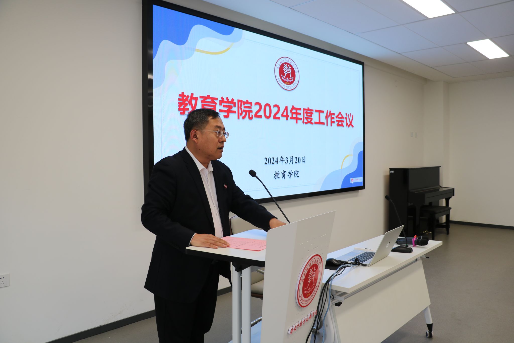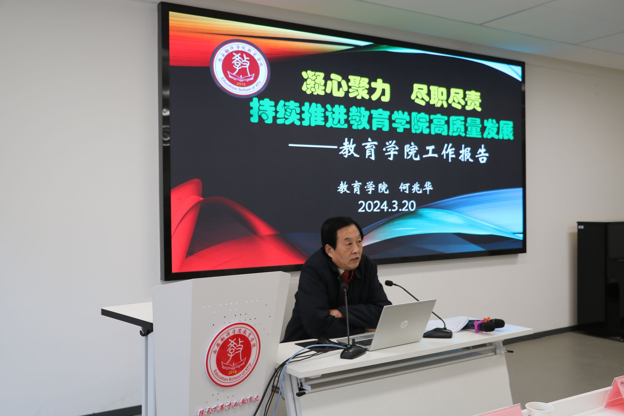 会上,院长何兆华做了题为《凝心聚力 尽职尽责 持续推进教育学院高质量发展》的工作报告,从审核评估、教学科研及学院整体教学秩序运行情况等方面对2023年度的工作进行了全面回顾和总结。他讲到,过去的一年来,教育学院始终坚持“建改管强”,扎实推进审核评估工作;坚持“质量立院”,努力提高人才培养质量;坚持“人才强院”,扎实提高队伍建设水平;坚持“学科兴院”,努力提高科学研究水平;坚持“文化铸院”,大力推进质量文化建设;坚持“特色名院”,探索培育本科教育特色;坚持“顶层设计”,推进治理体系和治理能力现代化。