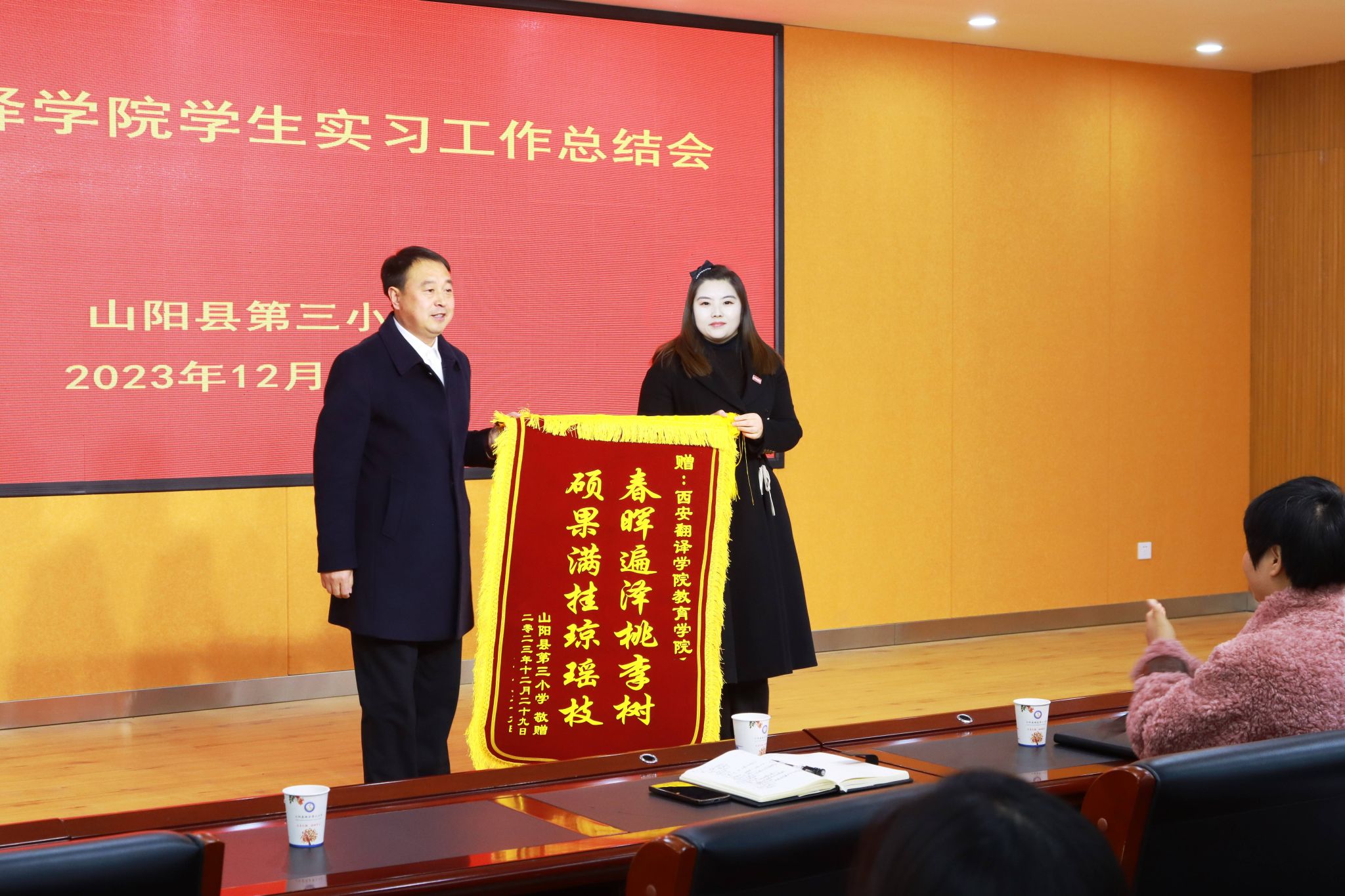 何福泰为西安翻译学院教育学院送上了绣着“春晖遍泽桃李树,硕果满挂琼瑶枝”的锦旗,以表达对西译的感谢和对双方合作的美好期待。锦旗不仅代表着三小对西安翻译学院教育学院的认可和赞扬,也象征着双方在教育领域的深入合作的后续开展。