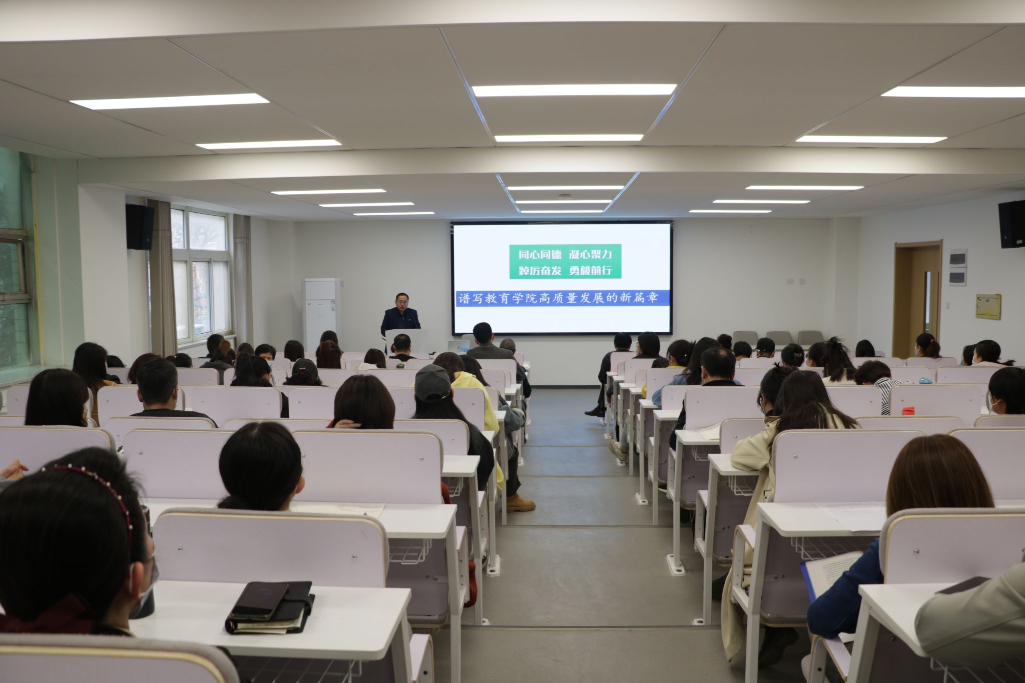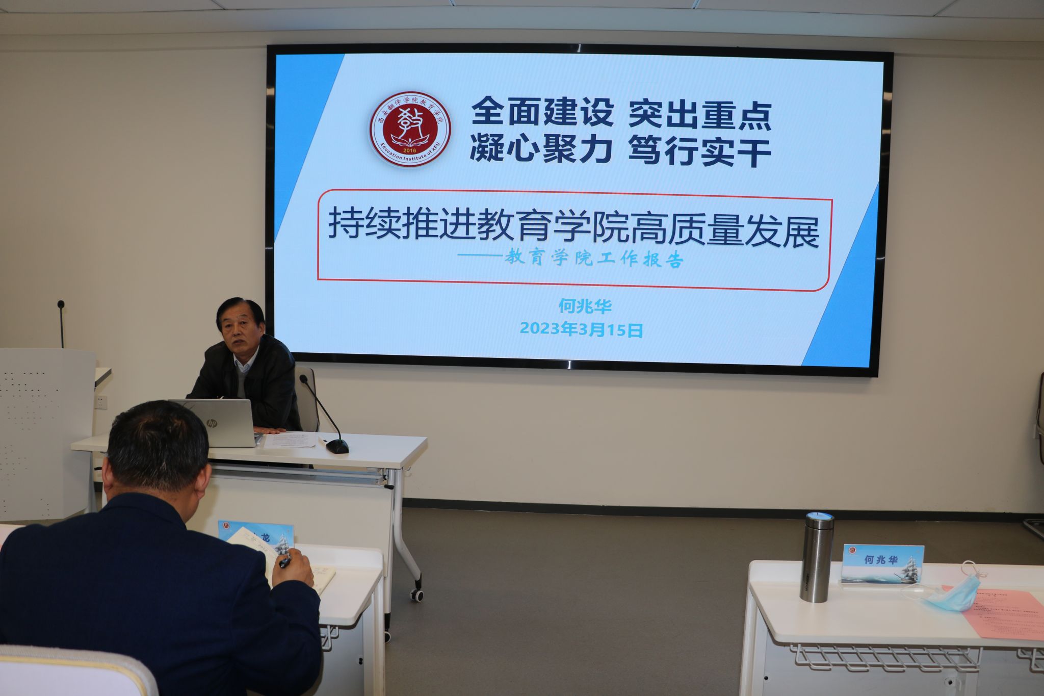 首先,院长何兆华做了《全面建设 突出重点 凝心聚力 笃行实干 持续推进教育学院高质量发展》工作报告,对2022年学院工作进行了回顾与总结,就学院2023年度重点工作做了部署安排。他讲到2022年全院师生员工认真学习贯彻落实习近平总书记关于教育工作的重要论述,紧紧围绕“建设有特色的应用型陕西省一流民办教育学院”发展目标,擘画了学院发展的蓝图,加强了学院的人才队伍建设,教育教学与人才培养质量显著提高,学科建设与科研工作有了新亮点,党的建设和学生工作亮点纷呈,学院文化建设取得新进展,服务保障能力得到增强,学院的办学实力和综合水平迈上了新台阶。2023年教育学院工作的总体思路是以习近平新时代中国特色社会主义思想为指导,全面学习贯彻党的二十大精神,遵循高等教育规律,坚持规划引领、计划推进,以内涵发展为主题,以提高教育教学水平和人才培养质量为目的,以通过“审核评估”为目标,以“专业认证”建设为契机,以教师队伍建设和学科专业建设为关键,以深化改革创新为动力,以党的建设和现代学院制度建设为保障,不断提高学院办学实力和办学水平,推进学院高质量发展。希望大家同心同德、凝心聚力、踔厉奋发,勇毅前行,谱写教育学院高质量发展的新篇章!