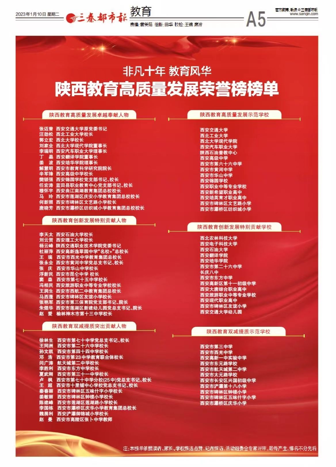 陕西教育作为全国教育资源云集的大省,在国家科教兴国、人才强国的战略指导下,为弘扬先进、以榜样的力量推动陕西教育高质量发展起到积极作用,主办方《三秦都市报》本着公平、公正、公开原则,面向全省各大、中、小学评选出“陕西教育高质量发展卓越奉献人物”、“陕西教育高质量发展特别贡献人物”、“陕西教育高质量发展示范学校”、“陕西教育高质量发展特别贡献学校”等多项个人和集体殊荣。