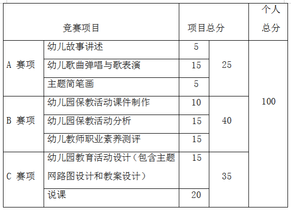 比赛分为三大赛项:A赛项包含儿童故事讲述、儿歌弹唱与歌表演、主题简笔画;B赛项包含幼儿园保教活动课件制作、幼儿园保教活动分析、幼儿教师职业素养测评;C赛项包含幼儿园教育活动设计、说课。