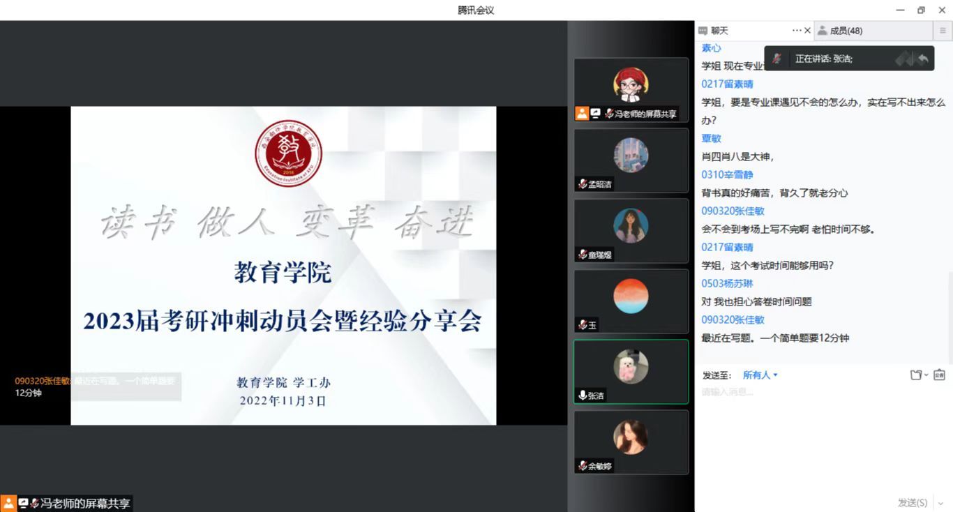 2023年硕士研究生入学考试即将进入50天倒计时,为帮助我院学子科学合理地规划考研进程,在冲刺阶段改进学习方法,提高学习效率,给考研学子加油鼓劲、缓解压力、增强信心,11月3日晚,我院召开线上2019级本科生考研冲刺动员会暨经验分享会。教育学院学工办主任冯祎洁主持会议,辅导员邓妙卿、张莉、彭美敬、刘正安老师,教育学院2022届毕业生张洁和2019级学前专业考研学生参加此次会议。