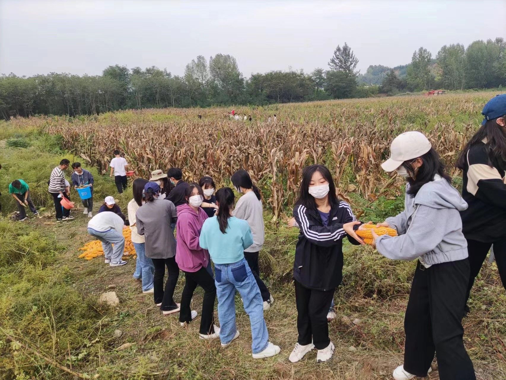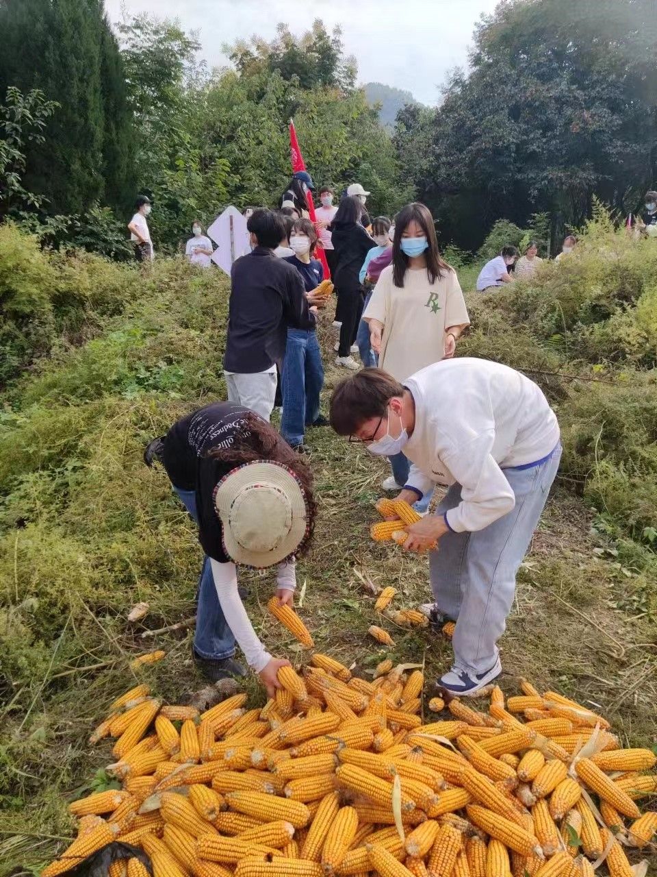 金黄的玉米粒就像列队的士兵一样整齐地排列着,等着老师和同学们的检阅,同学们每人一排、齐头并进,穿梭在玉米丛之间,“一掰、二剥、三放”,很快就掌握了掰玉米的要领,效率越来越高,经过两个多小时热火朝天的劳动,掰下来的玉米棒,堆成一座座金色的小山,很是惹人喜爱。