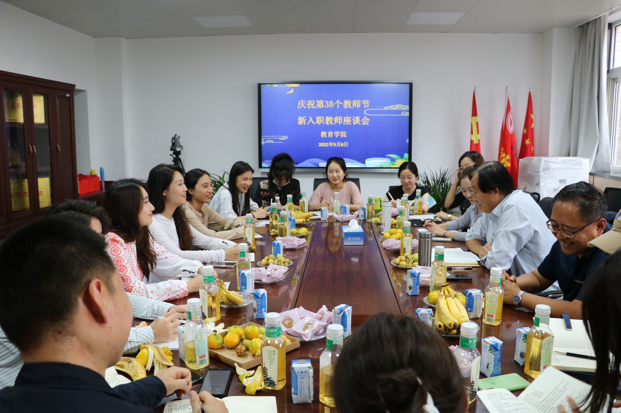 在第38个教师节来临之际,9月8日下午,教育学院在二楼会议室组织召开了教育学院庆祝第三十八个教师节暨新入职教师座谈会。教育学院院长何兆华、党委书记王小龙、副院长庞小佳、辛维英,综合办办主任张改宁及14位新入职教师一同参会。会议由教育学院副院长庞小佳主持。