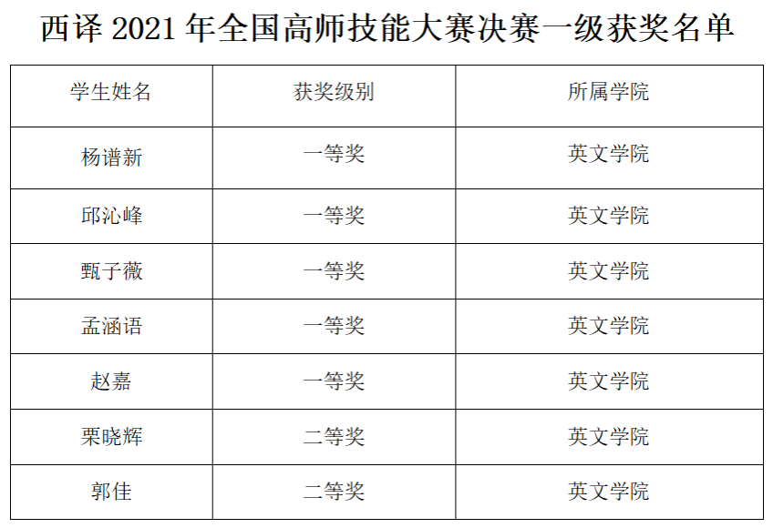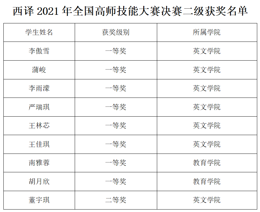 本次大赛分为一级和二级两个级别,分别对应高职组及本科(研究生)组。全省共有来自陕西师范大学、西安外国语大学等22所高校的2415名学生参加初赛,其中241名学生入围决赛。本次比赛我校一等奖获奖比例在全省名列前茅,获得了陕西师范大学和西安外国语大学等高校的一致认可,再次提升了我校英语专业在陕西省的影响力,为我校英语国家一流专业建设做出应有贡献。