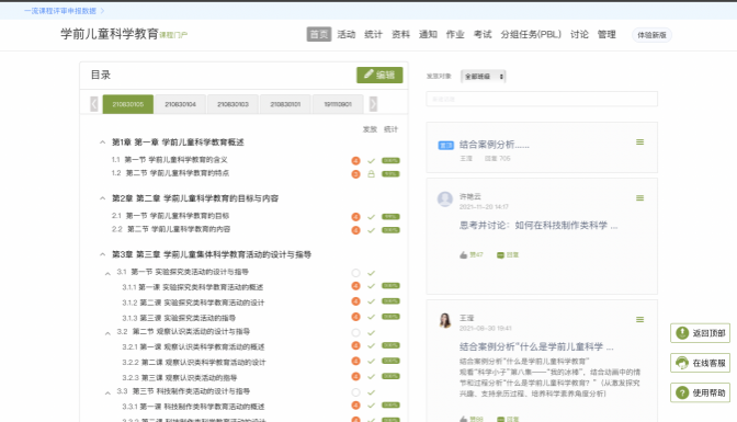 再次,《学前儿童科学教育》课程基于学情分析与课程目标,本次线上课程设计的整体思路如下:前端设计、构建混合式线上教学环境、混合式线上教学实施阶段、对线上教学质量进行评估检测。本课程课程教学依托学习通平台,使用较为完善等自建课程,借助腾讯课堂和腾讯会议,积极开展线上授课和线上学习等在线教学活动,保证疫情防控期间教学进度和教学质量。其中线上自建教学资源较为丰富,视频资源29个,时长304(分钟),其他资源120(个),试题数量31(个),学生评价较好。