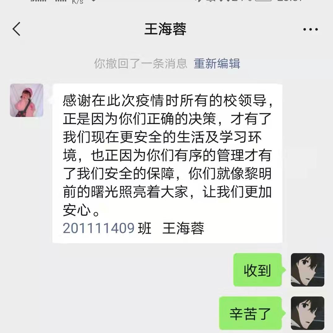 王海荣同学感谢在此次疫情时所有的校领导,正是因为你们正确的决策,才有了我们现在更安全的生活及学习环境,也正因为你们有序的管理才有了我们安全的保障,你们就像黎明前的曙光照亮着大家,让我们更加安心。
